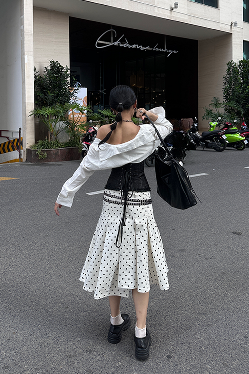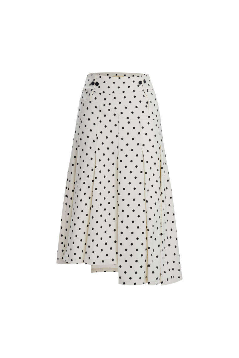 - The dress features an eye-catching asymmetric design combined with pleats, creating a structured silhouette while maintaining a flared shape.