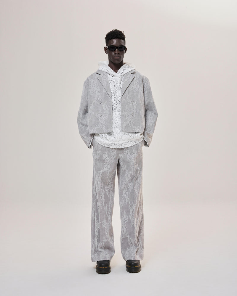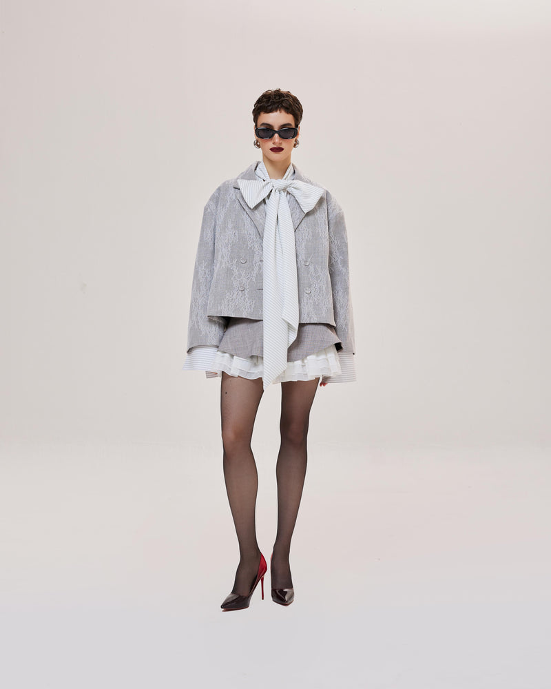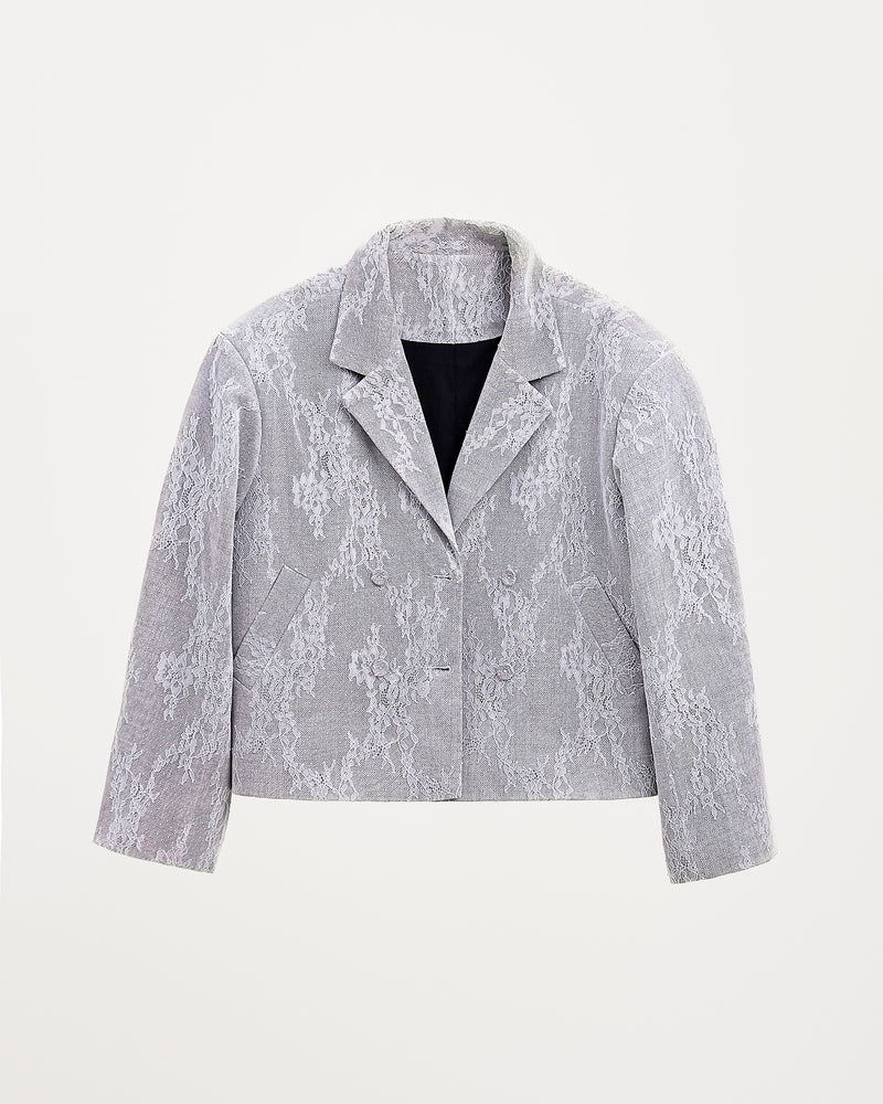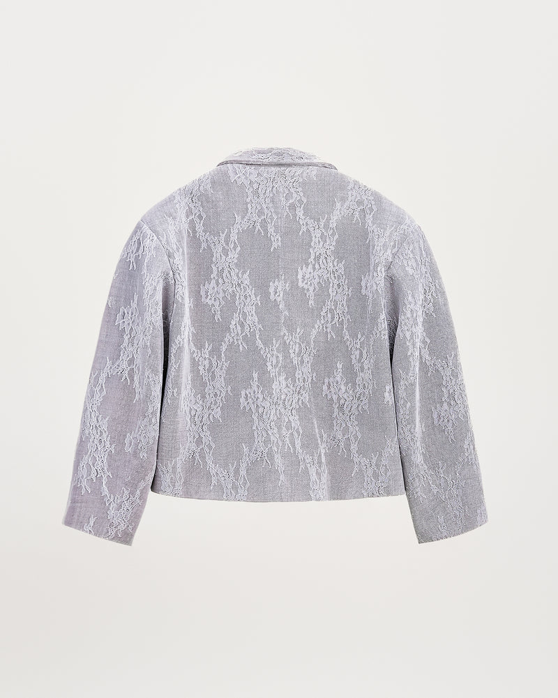 - The interesting highlight is that the shirt is covered with a layer of lace on a gray linen background, creating a new and unique overall look.
