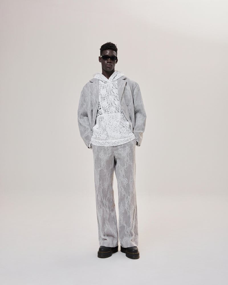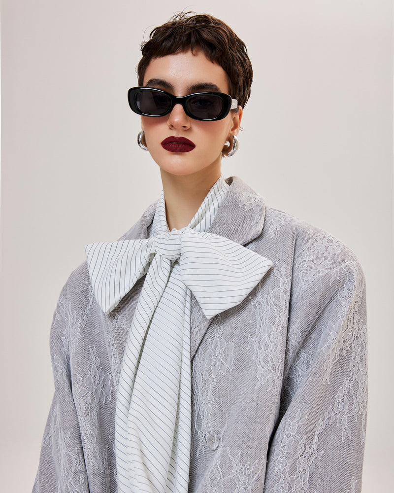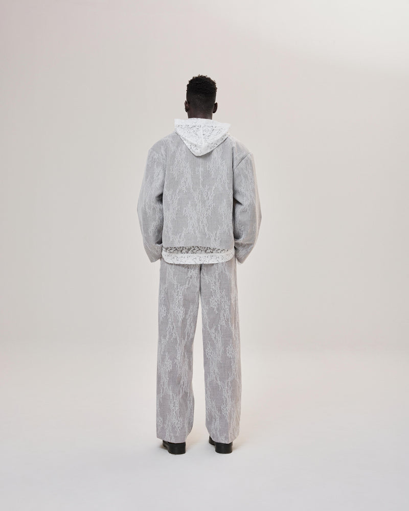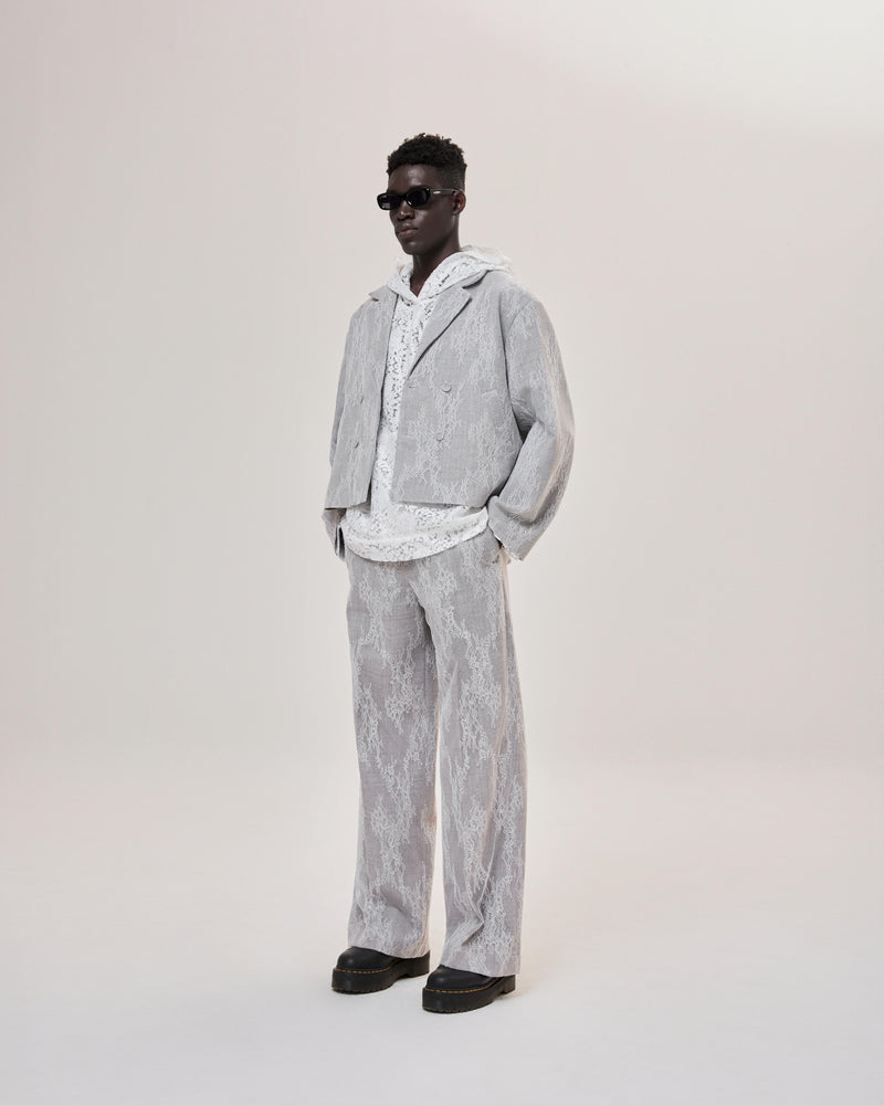 - The interesting highlight is that the shirt is covered with a layer of lace on a gray linen background, creating a new and unique overall look.