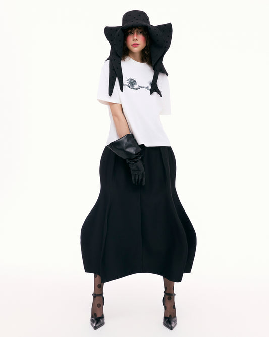- The design highlights the back in a seductive manner, while the neckline is adorned with multiple handcrafted monstera leaves, adding a unique touch and enhancing the charm of the outfit.