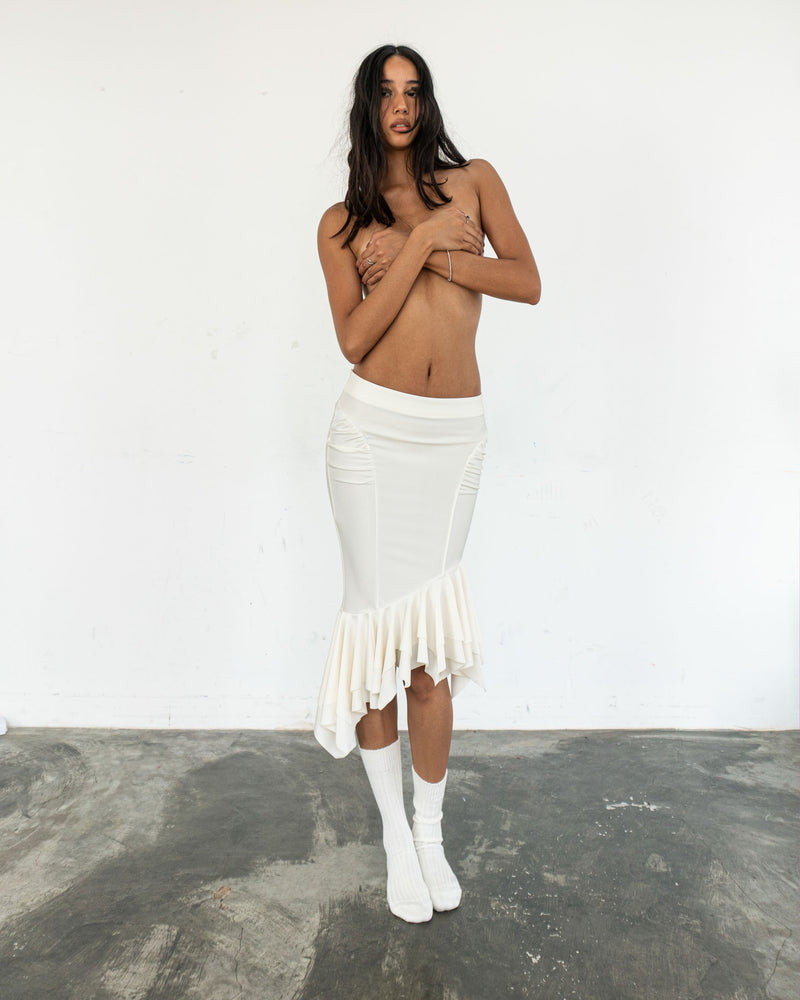 - A midi Flared Skirt with an asymmetric ruffle hem features standout metallic colors. Made from soft, stretchy fabric for a comfortable close fit and perfectly hugging your body.