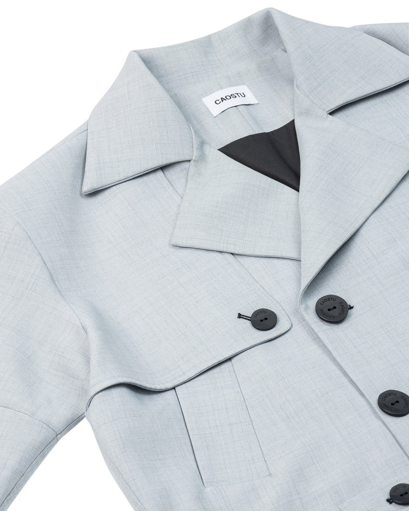- Two discreetly hidden pockets on the side body and a prominent row of buttons complete the look.