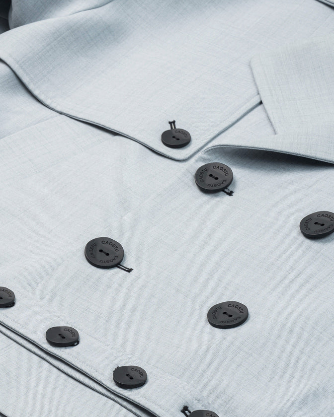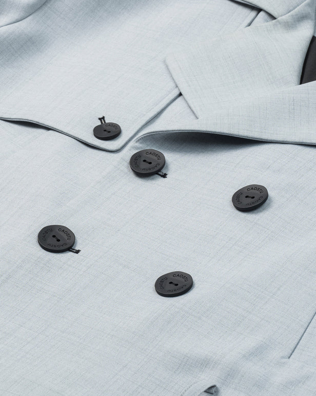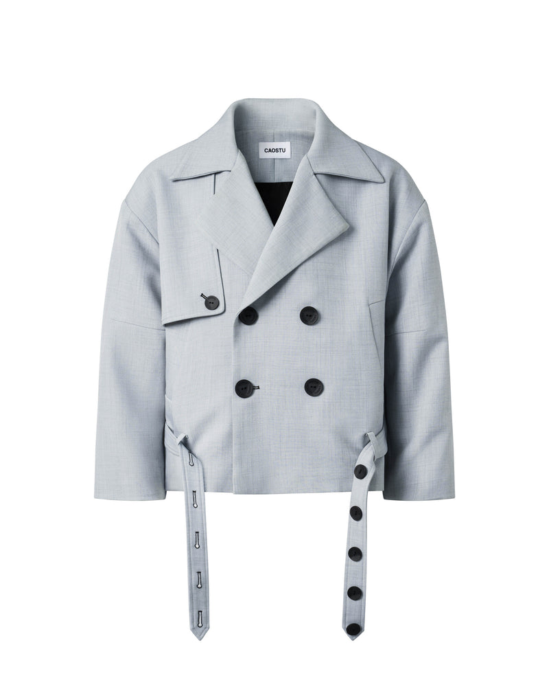- The design features a double-breasted closure with eight buttons and a waist belt for adjustable sizing.