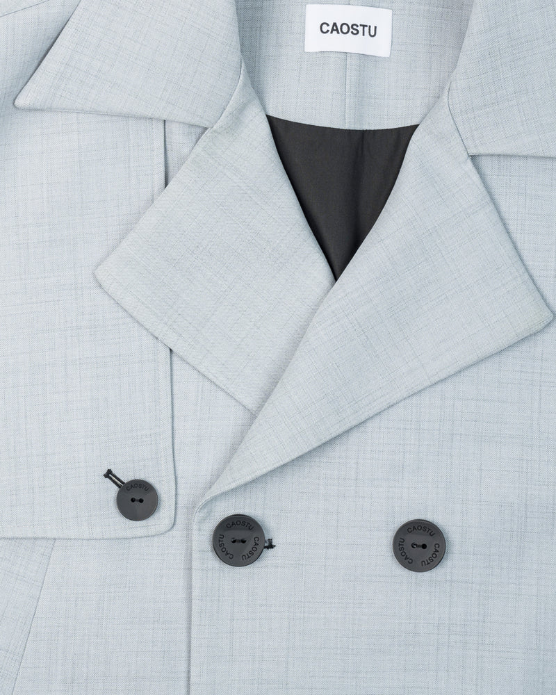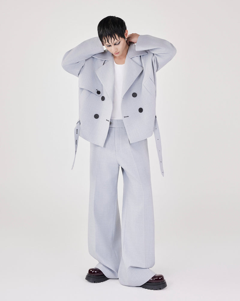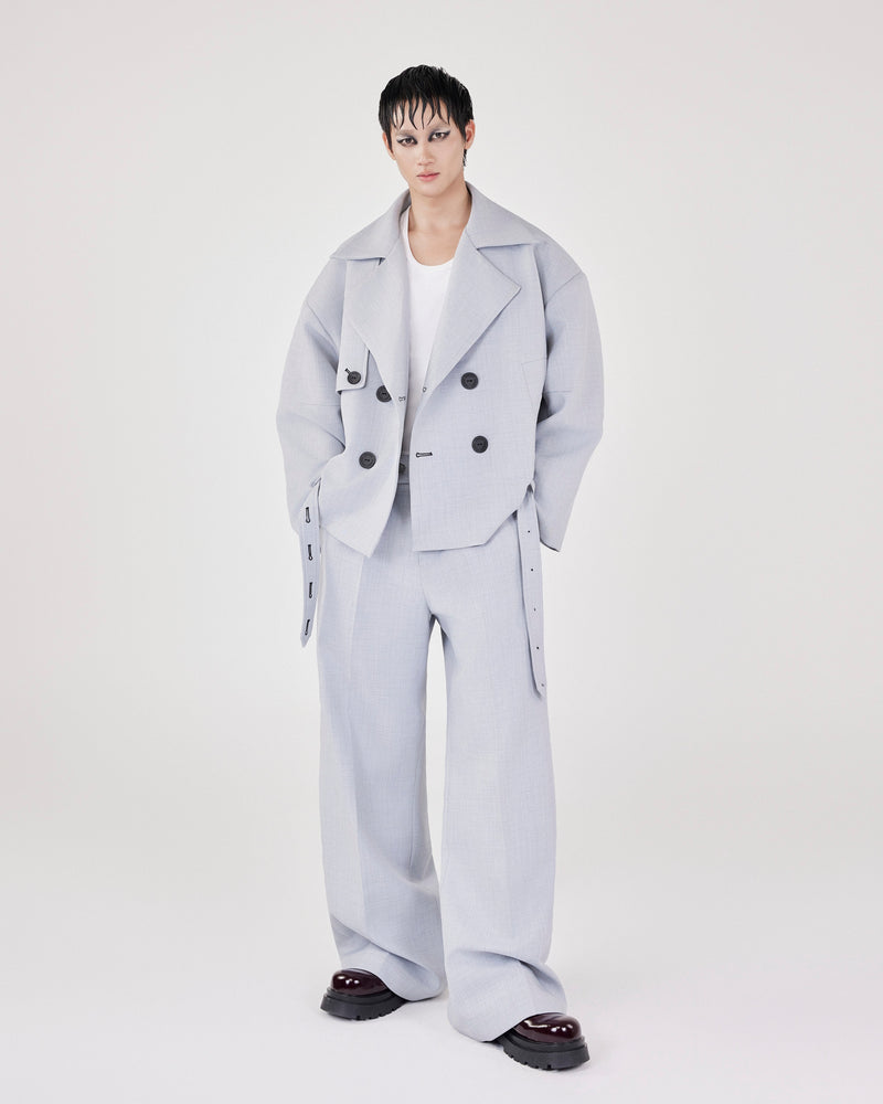 - Its structured shape, reinforced with shoulder pads, is inspired by classic trench coats but reinterpreted with a minimalist language and powerful silhouette.