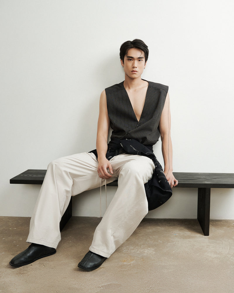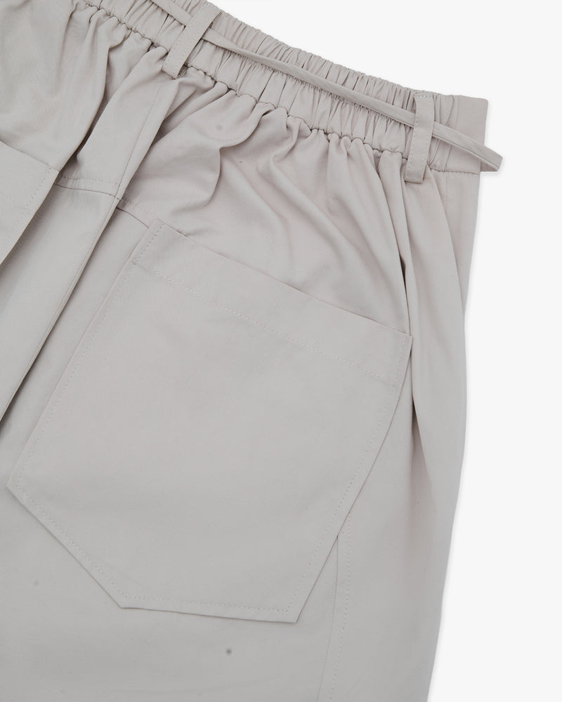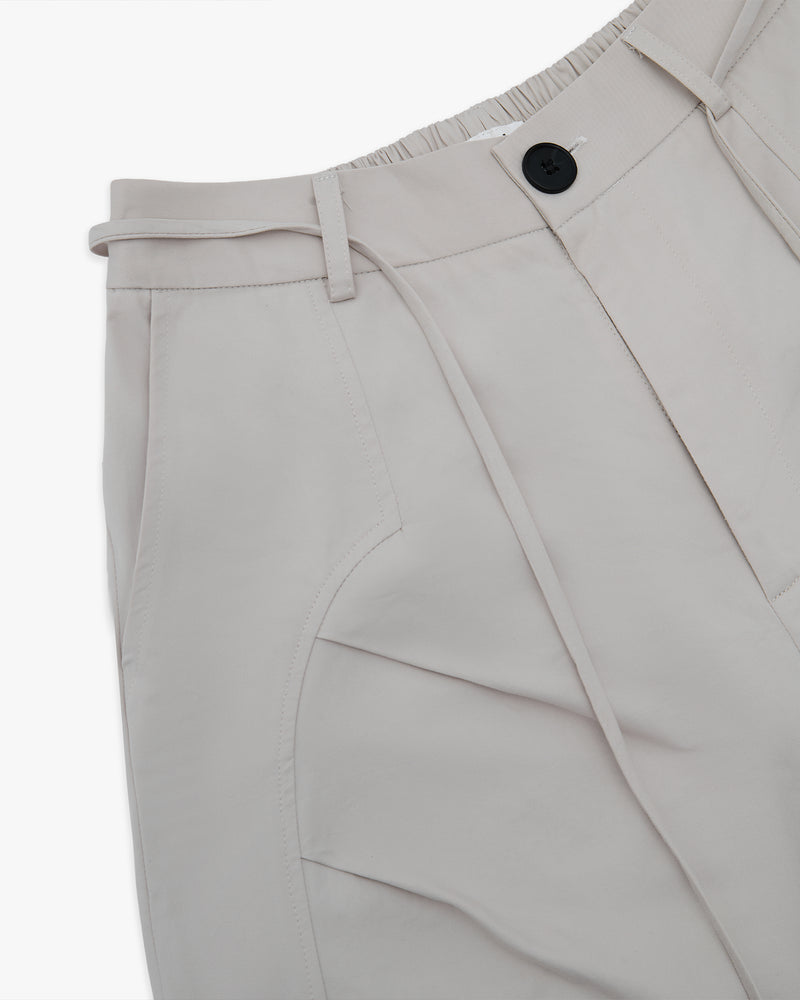 - The design is defined by sculptural, forward-slanting seam lines that contour the hips and lead into deep, angular pockets, adding dimension and a subtle utilitarian edge.
