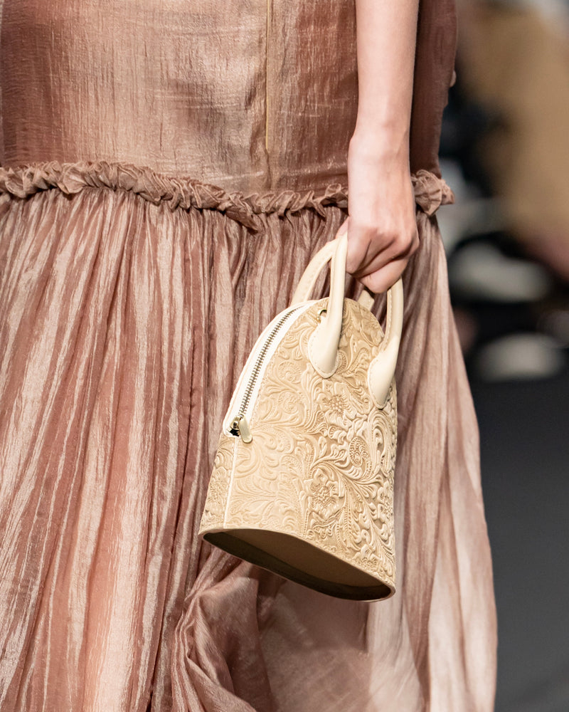 - Gentle summer sunlight drapes softly over the lush alluvial plains along the banks of the Cổ Chiên River. The crisp freshness of early morning mist and the purity of the delicate sunrays are deeply embedded in the serene beauty of the Lò Gạch bag. Delicate floral motifs are meticulously hand-carved on suede.