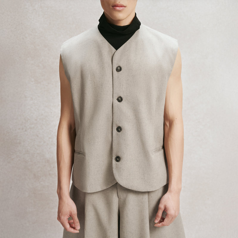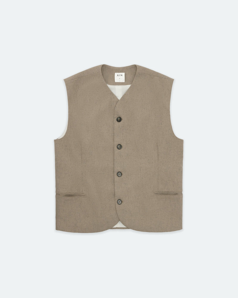 - Ramie-blend fabric with a subtle salt-and-pepper texture