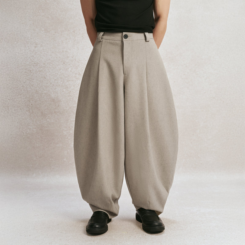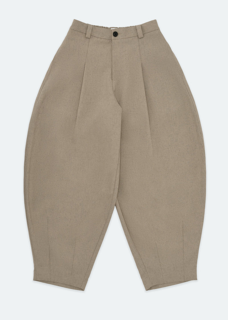 - Contemporary tailoring pants inspired by the sculptural form of pottery vessels.