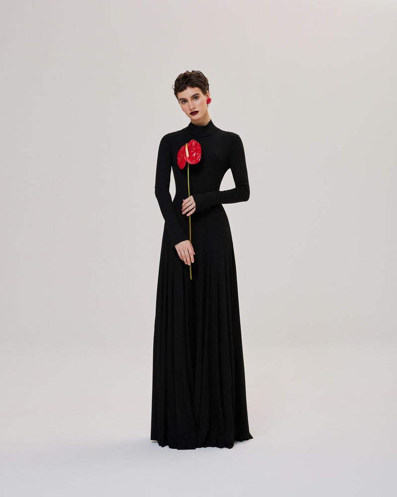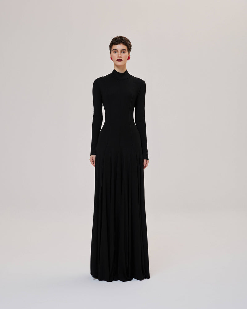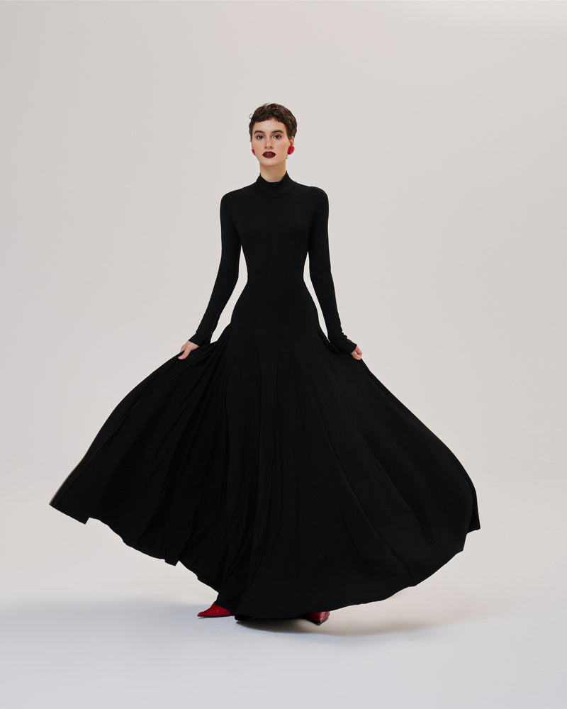 - The flared dress is pieced together with many fabric bodies to create a graceful overall look.