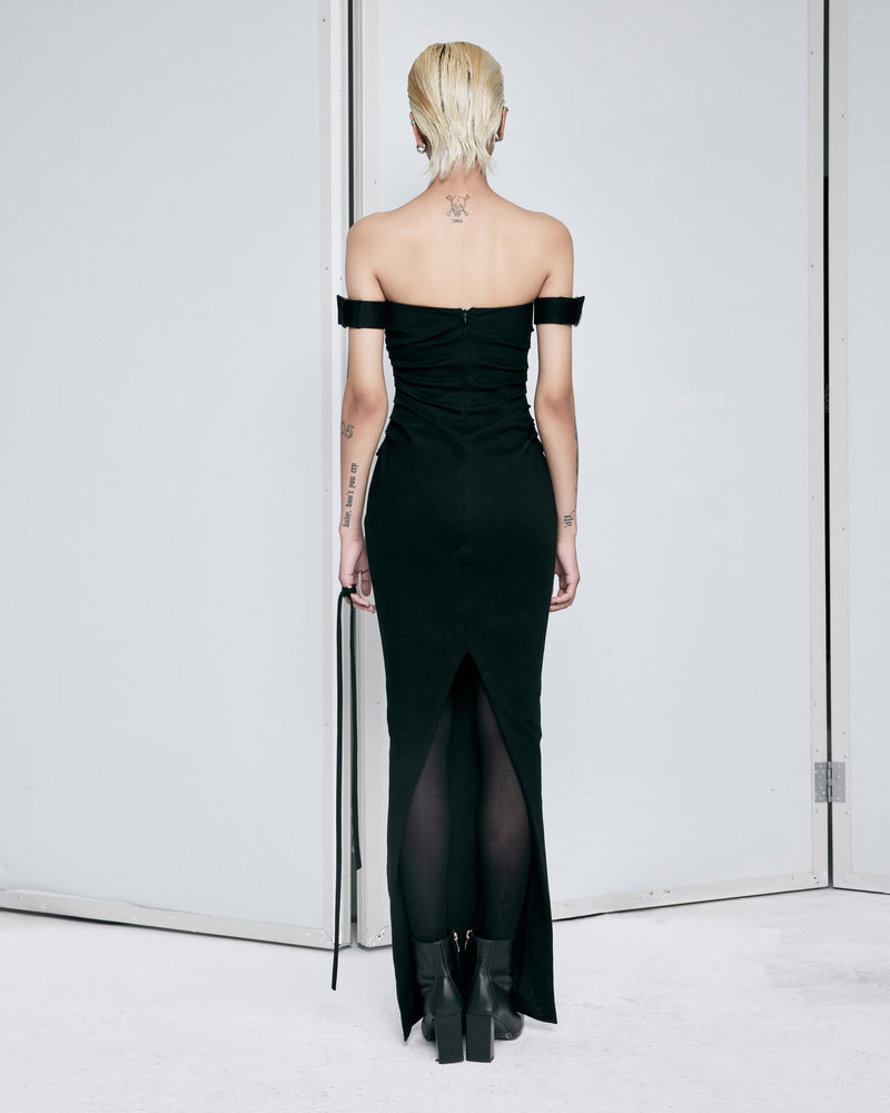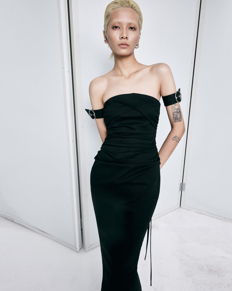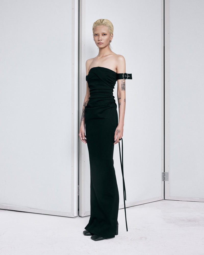 - Stretchy black denim bustier dress with black silk habotai lining and upper arm straps.