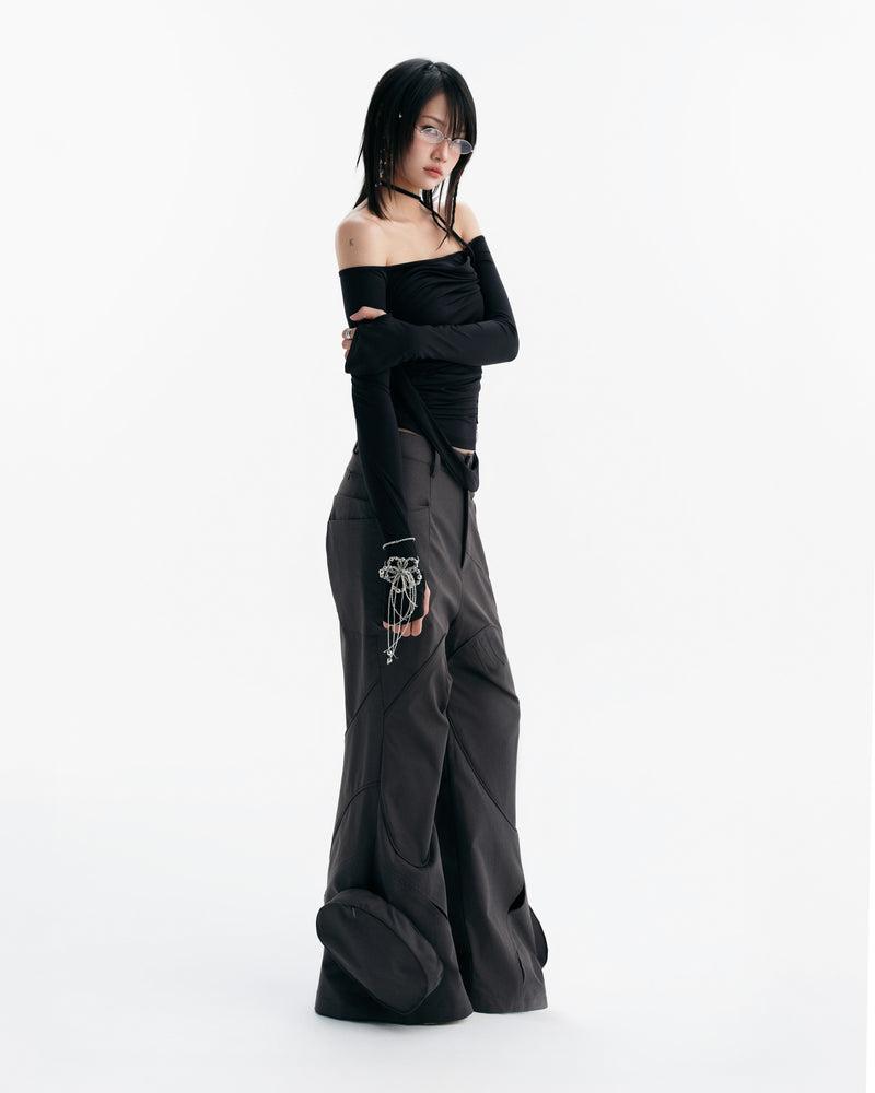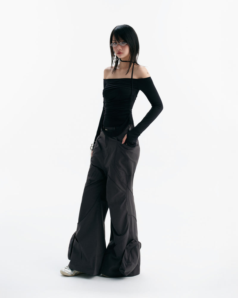 - Off-shoulder, long-sleeved top with finger holes and pleated details.