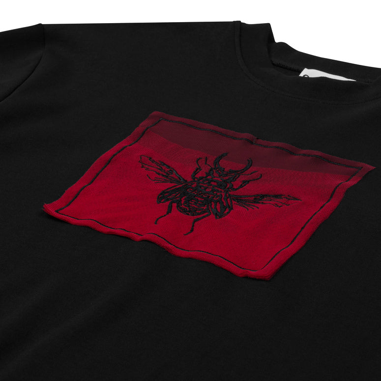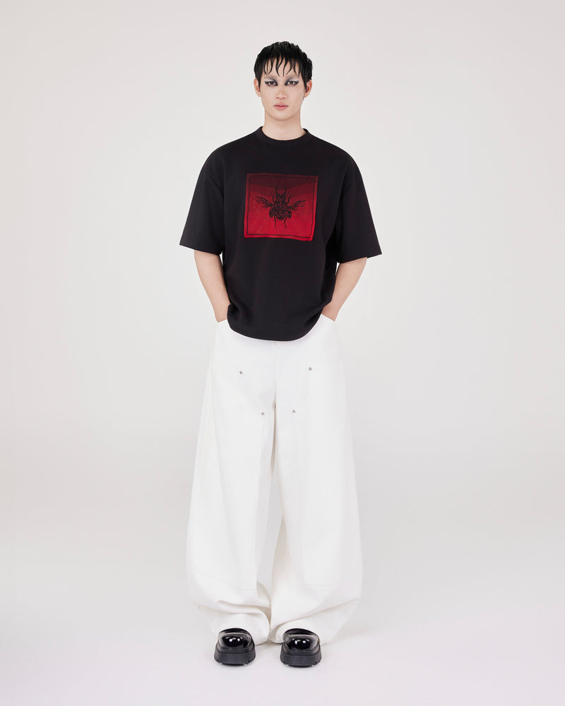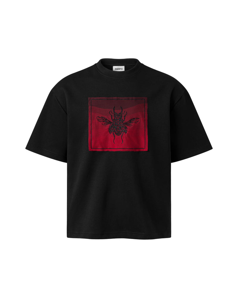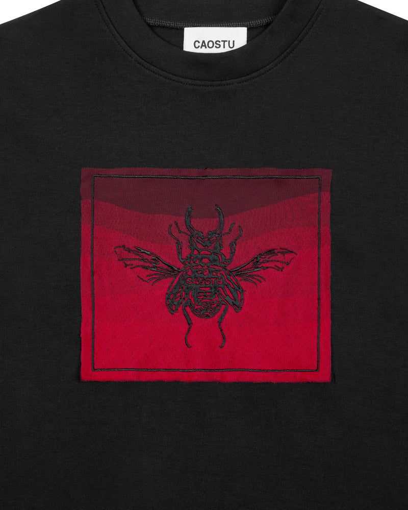 - The centerpiece is a beetle motif embroidered using the tatami technique, set within a square frame.