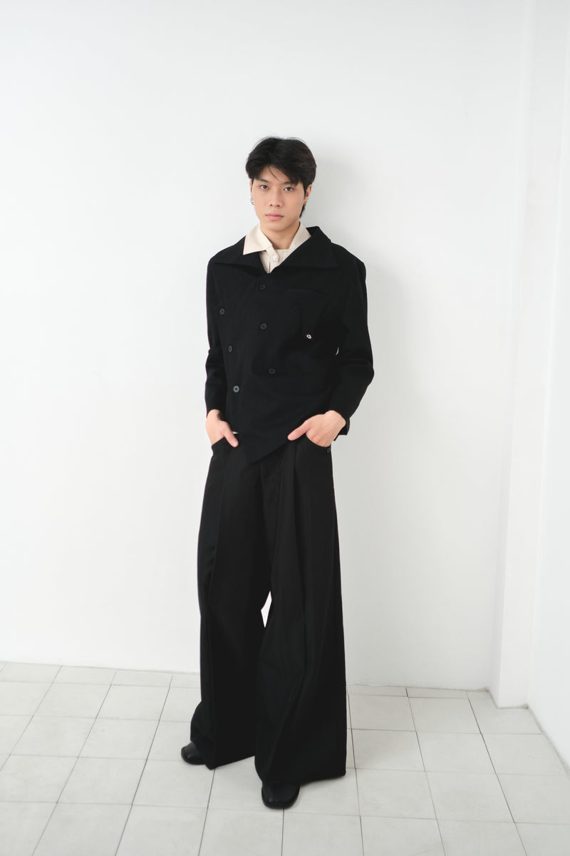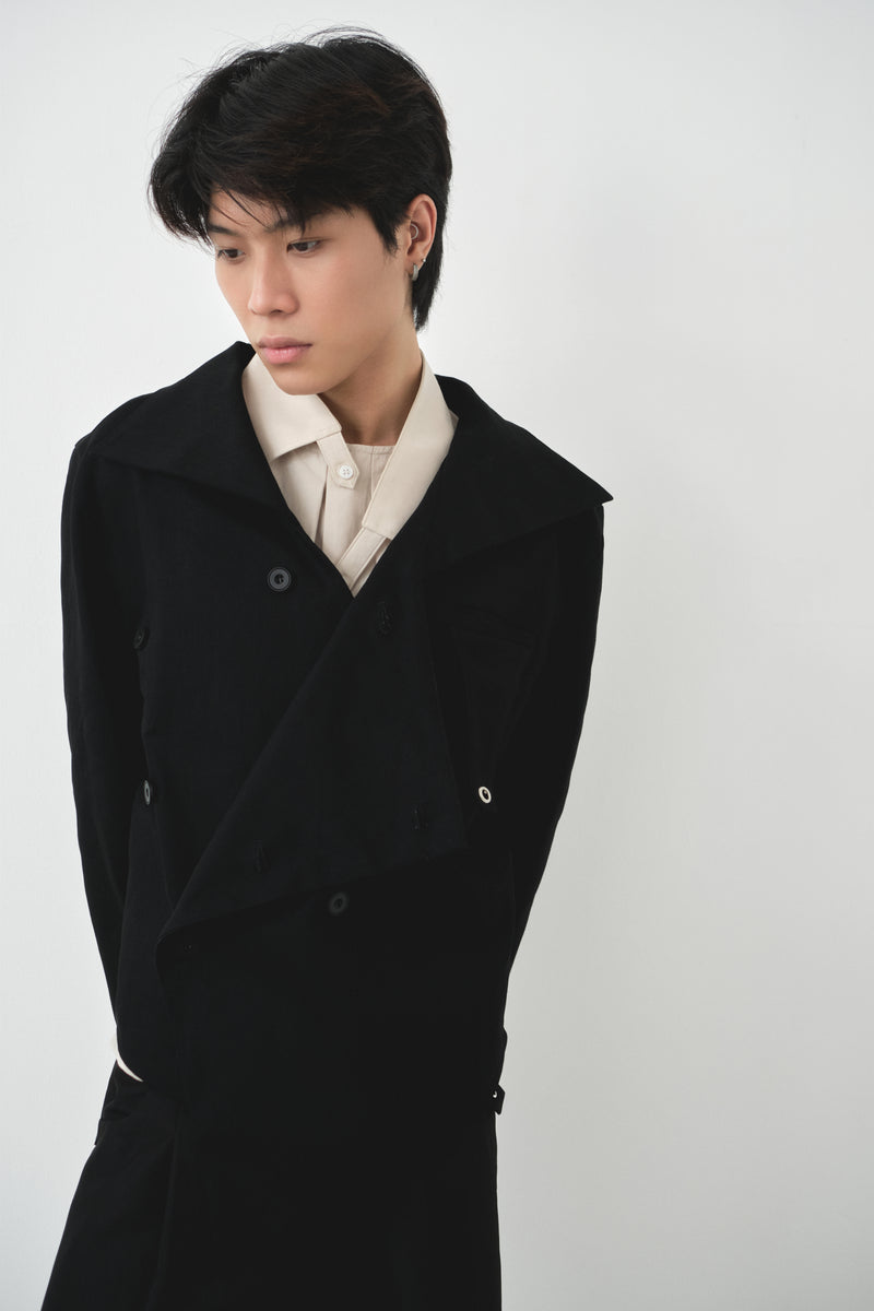 - Double-breasted closure and exaggerated pointed collar