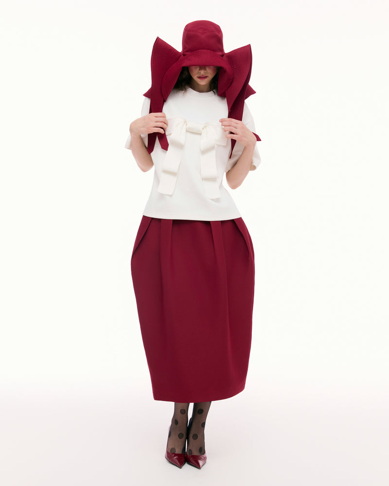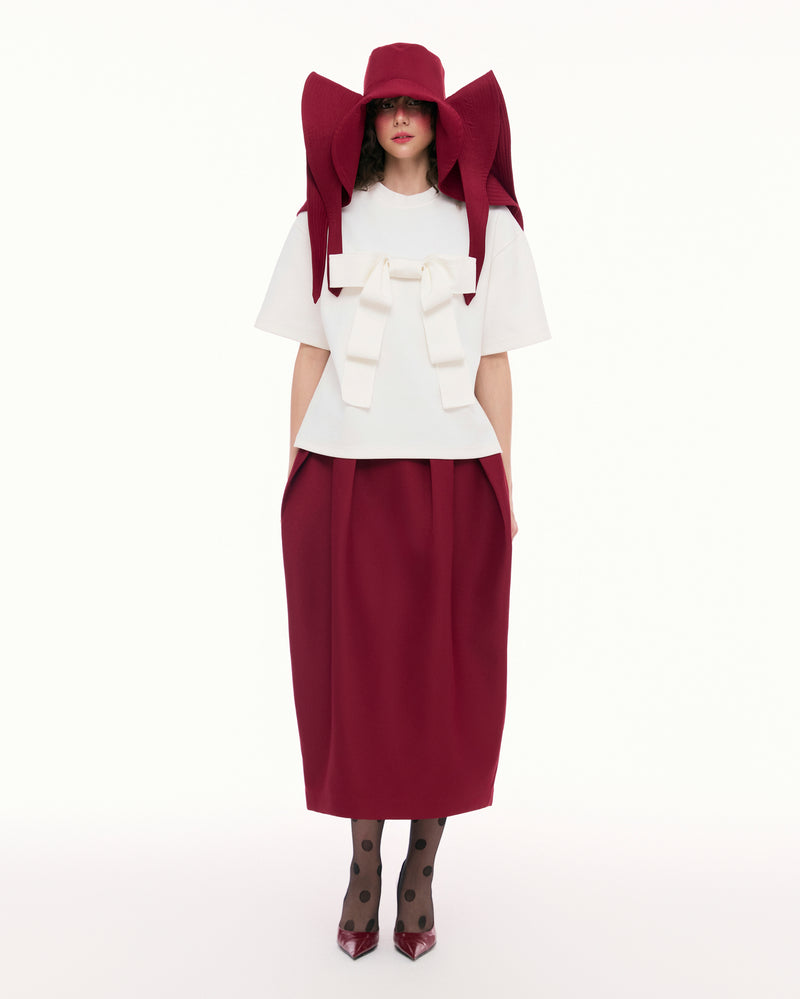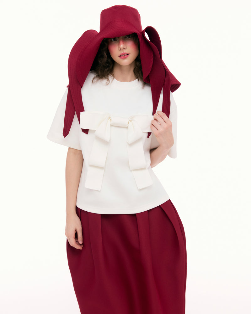 The standout detail is the oversized bow placed at the center front—both soft and bold—symbolizing the intersection of femininity and a free-spirited attitude.