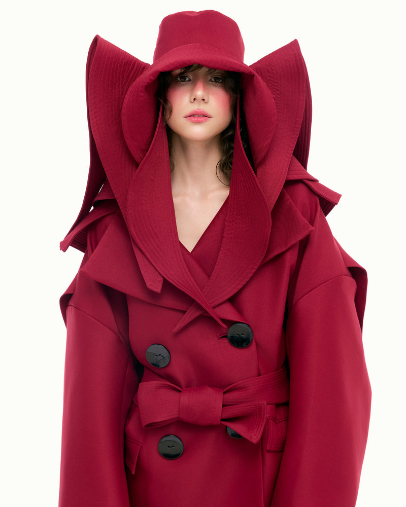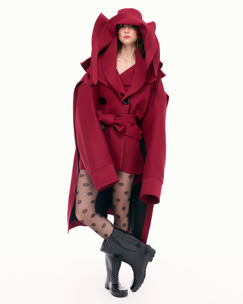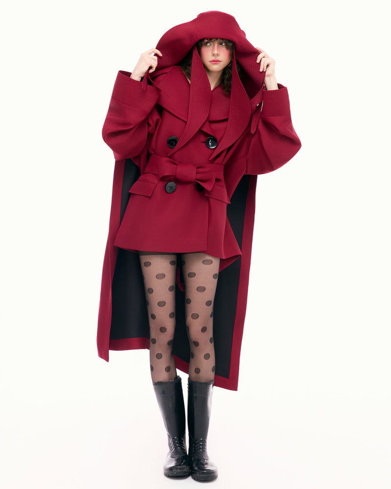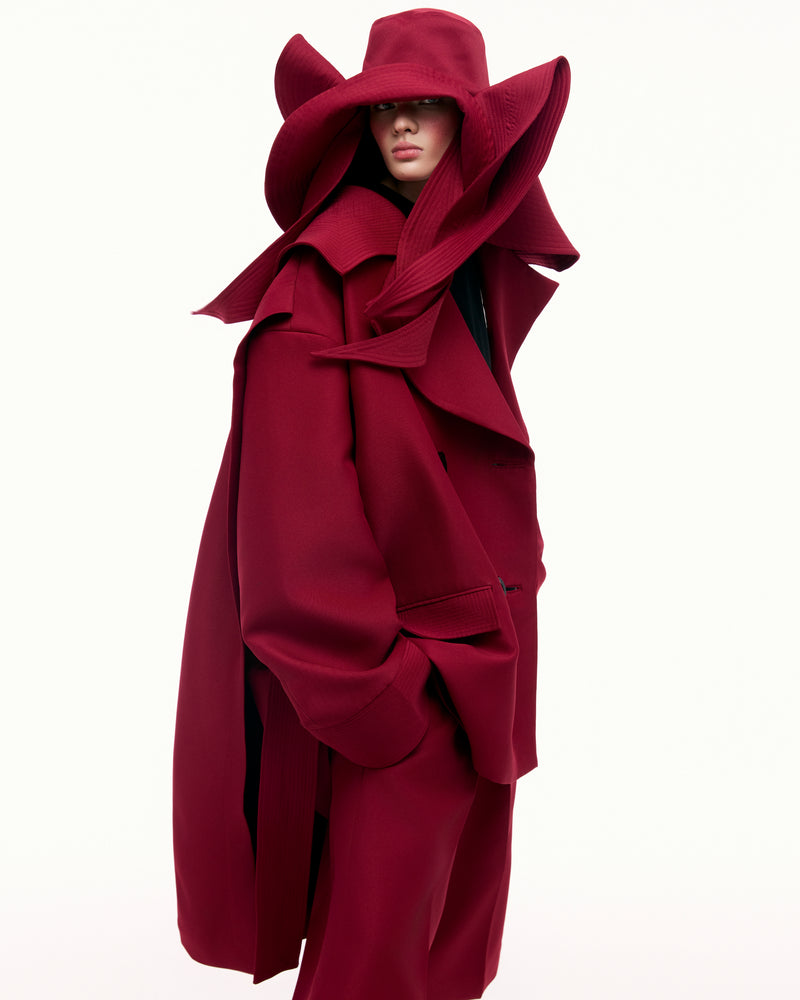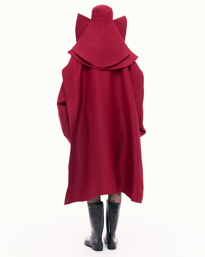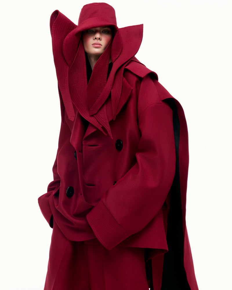 Description: An oversized coat featuring a large notched collar. The shoulder yoke and pocket flaps are detailed with matching topstitching, while the oversized buttons create a modern focal point. The back of the coat is designed with an added cape, giving it a distinctive and signature look.