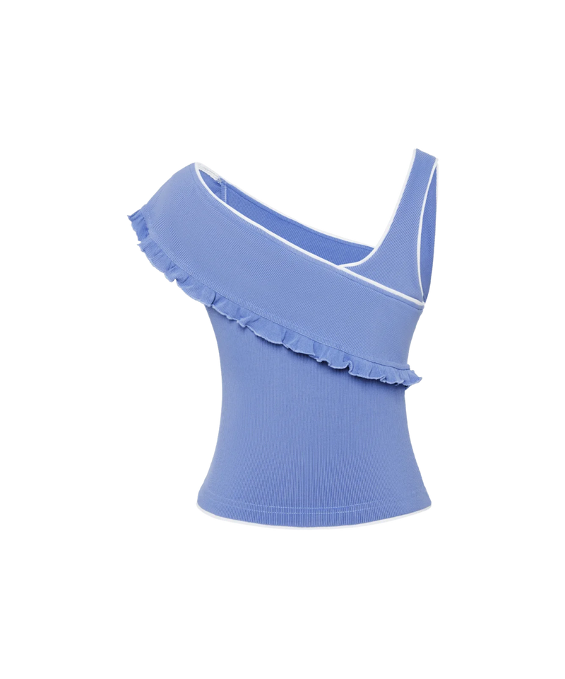 - An off-shoulder embellished top with a wide folded neckline and ruffled trim, highlighting the collarbones while subtly concealing the upper arms.