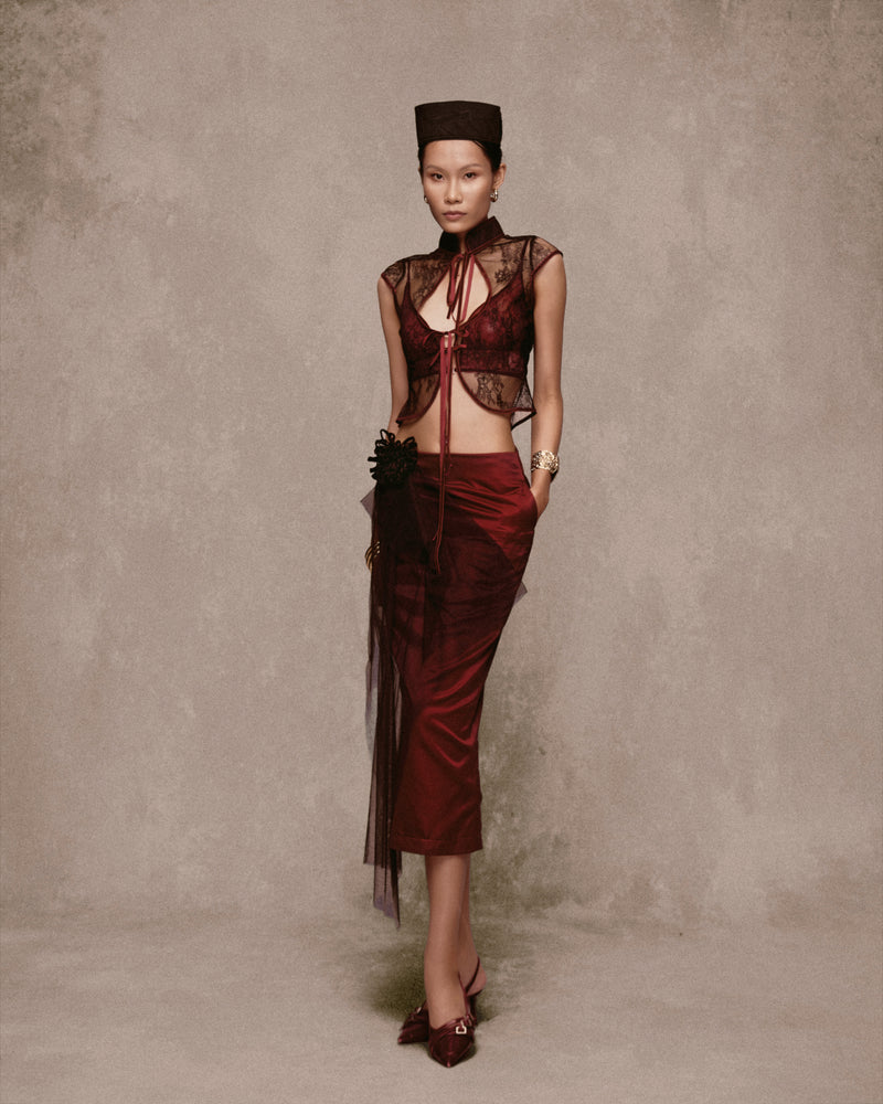 - A graceful Mandarin-inspired collar meets striking tie details, shaping a look that is unapologetically feminine, bold, and sensual.