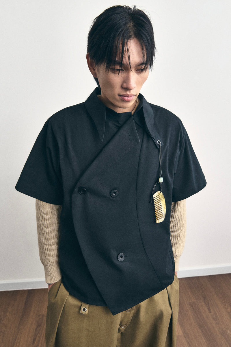Basic silhouette short-sleeve shirt with a curved hem, asymmetric front panels with button closure, back pleat detailing, and a pointed collar.