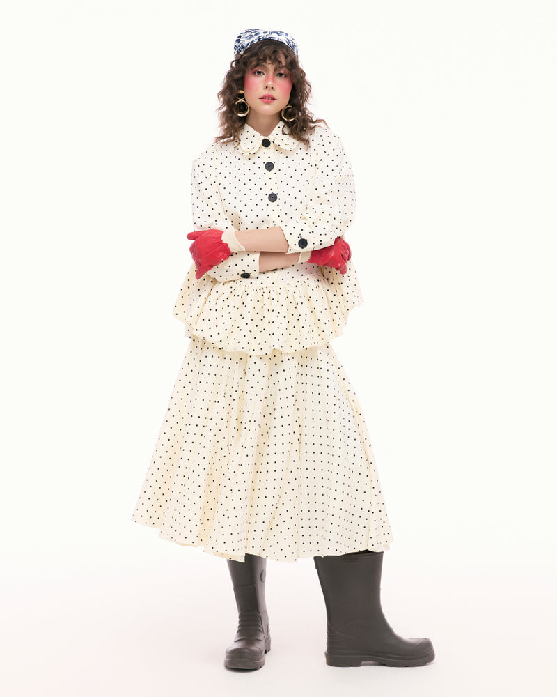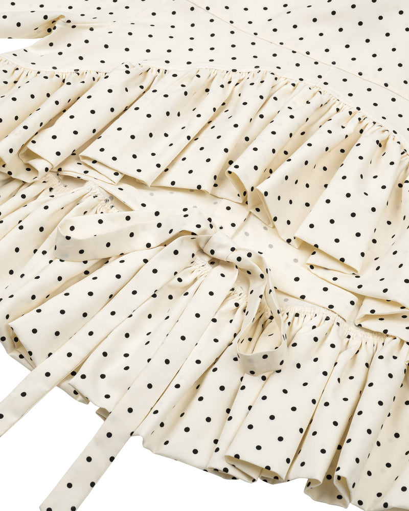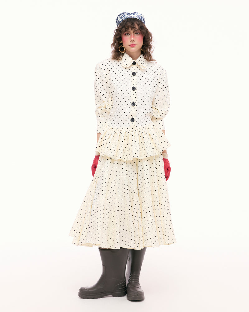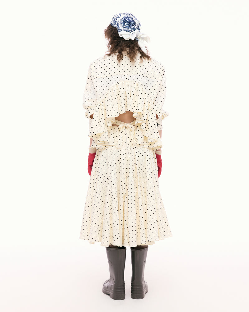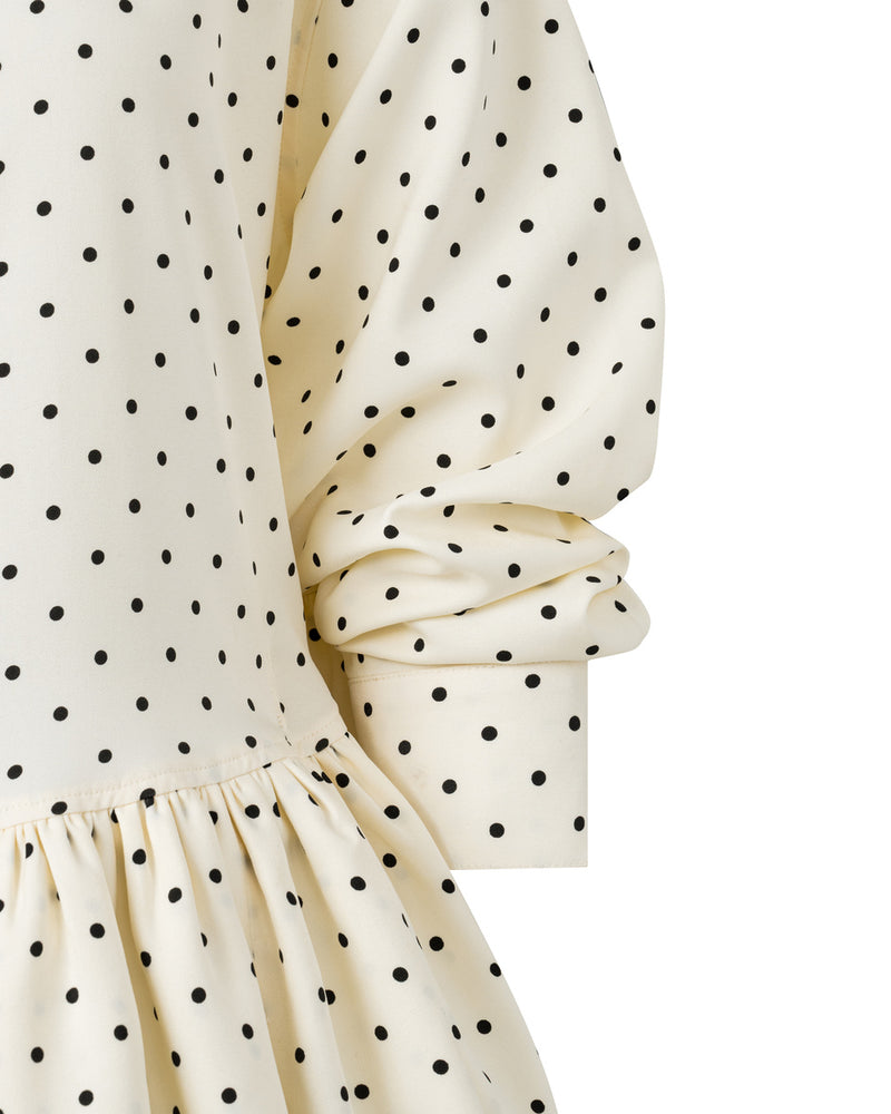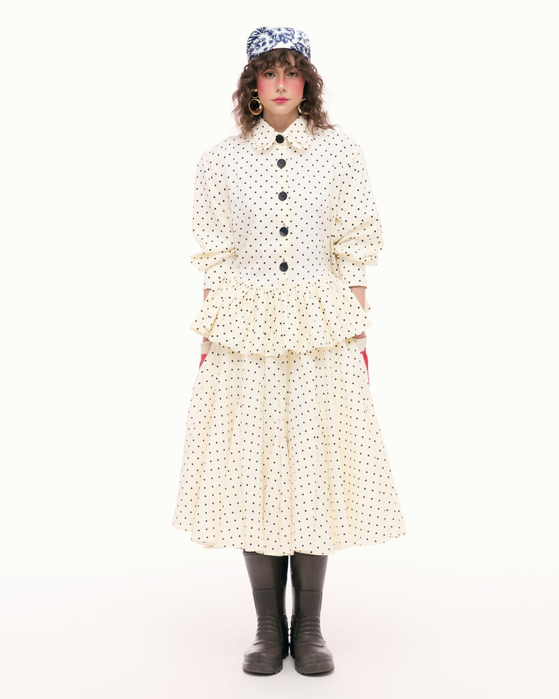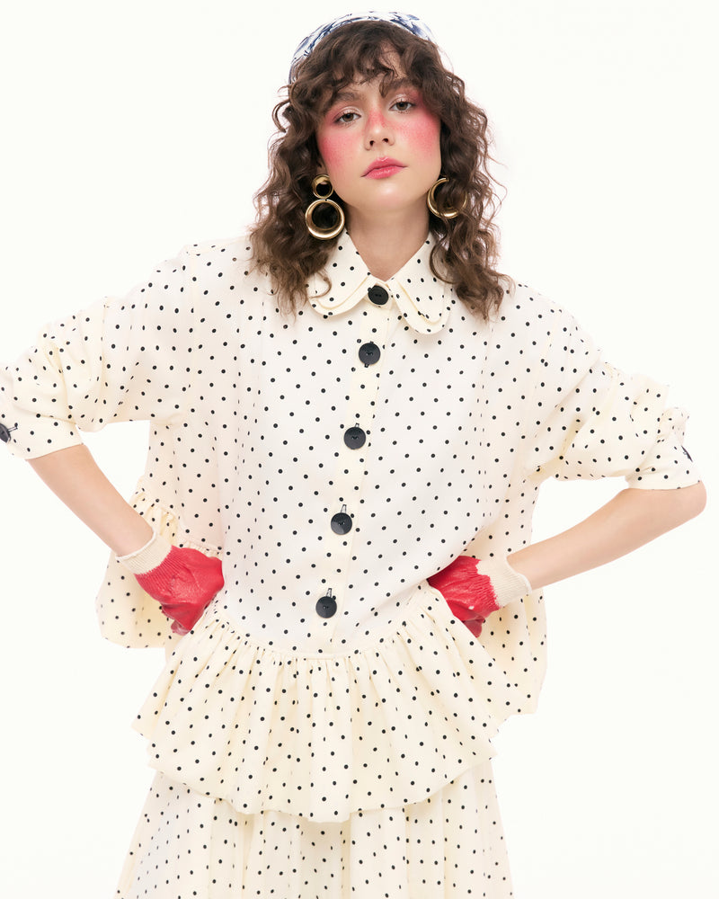 Description: This baby doll-style shirt is made from a silk cotton blend with a polka dot pattern. The shirt's defining feature is its round, layered collar, with a large collar sitting atop a smaller one. A gathered peplum runs from the front to the back of the shirt, and an open back design adds a touch of charm and allure. The long sleeves provide a modest and elegant look, complemented by oversized buttons down the front.