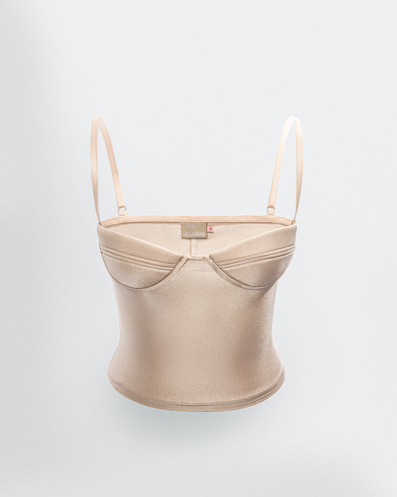 - Slim-fit corset-inspired top featuring delicate straps and sculpted cups.