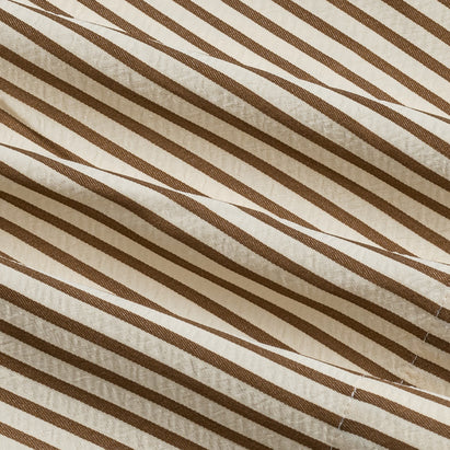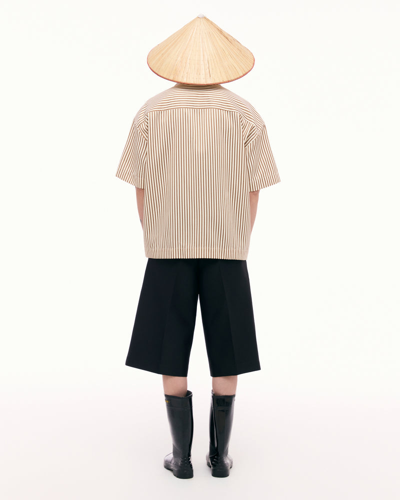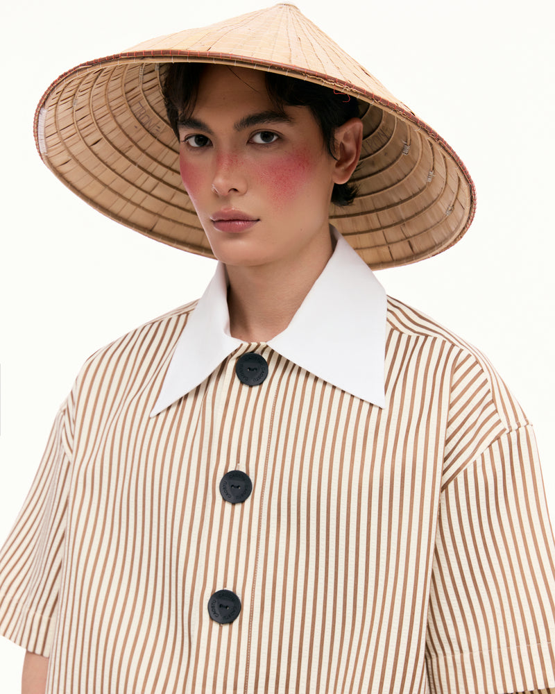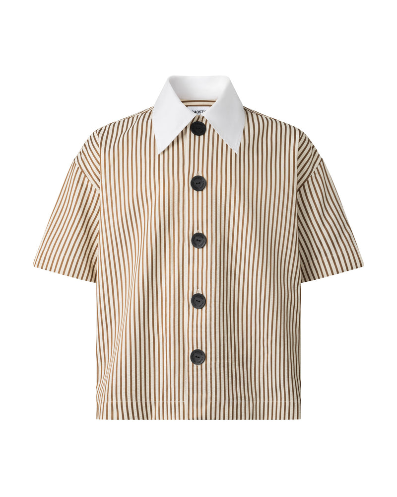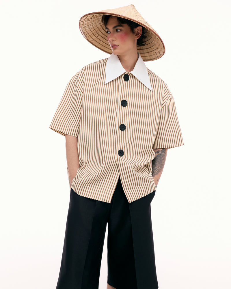 An oversized shirt with a straight hem, featuring a wide white collar that contrasts with the brown–cream vertical stripe pattern on the body, creating a balanced visual effect and a subtle retro feel.