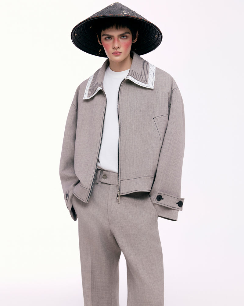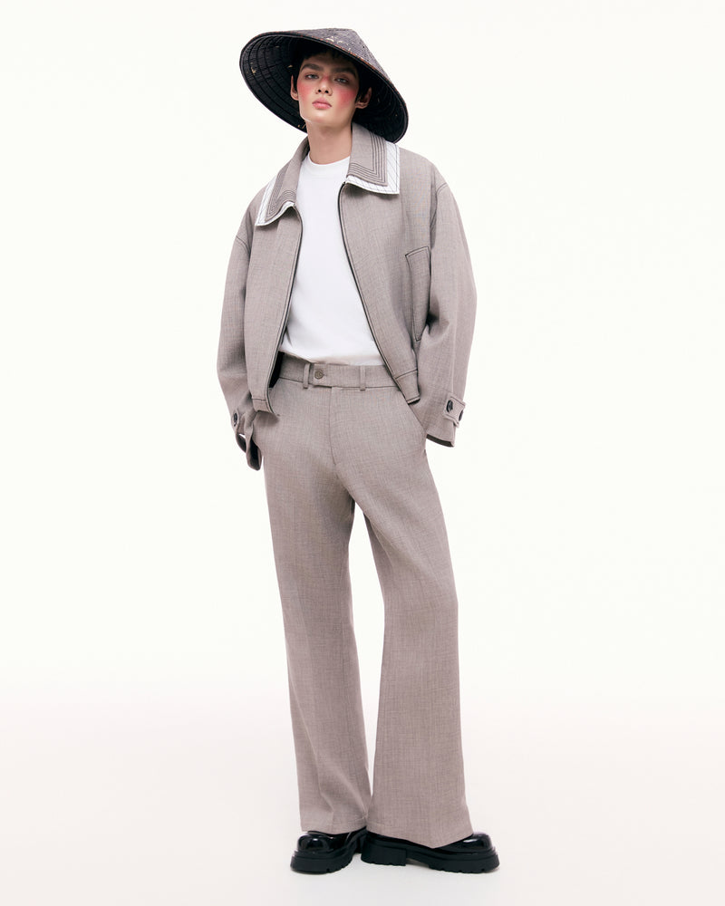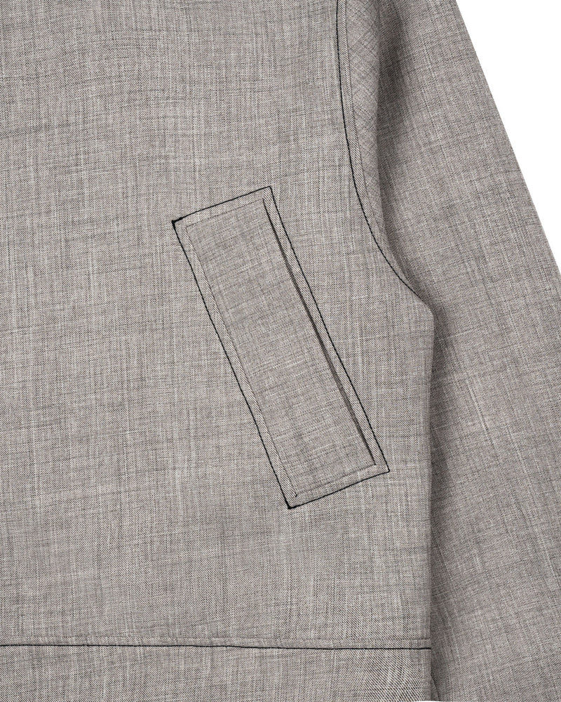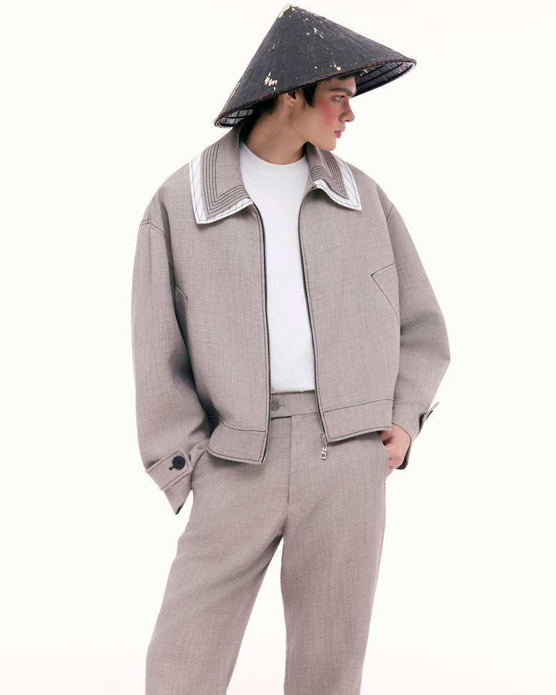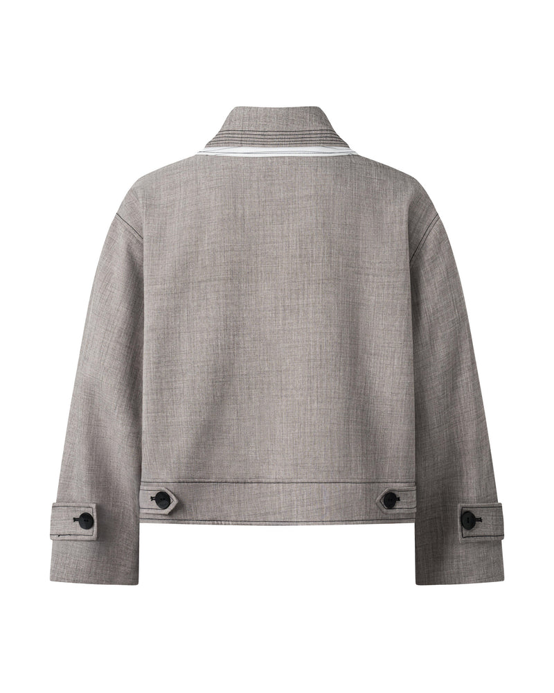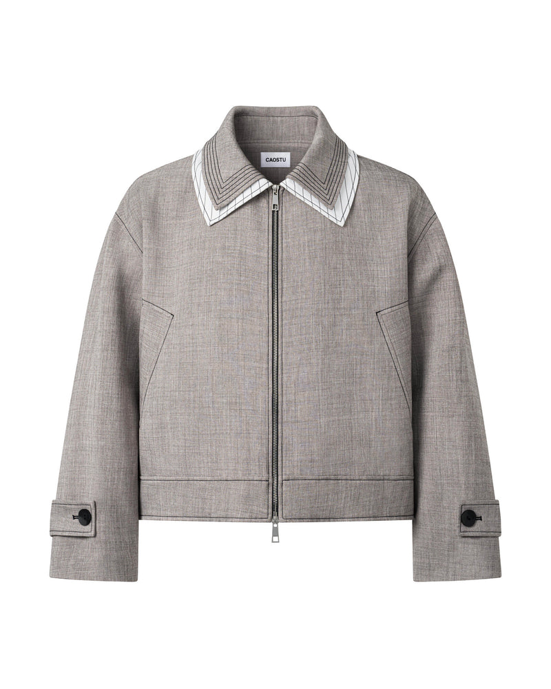A short-fit jacket crafted from gray linen. The standout feature is the double-layered oversized collar—the gray topstitched collar overlaps a white striped collar, creating a subtle, modern contrast. Dual-ended metal zippers and slanted pockets add practicality and ease for the wearer.