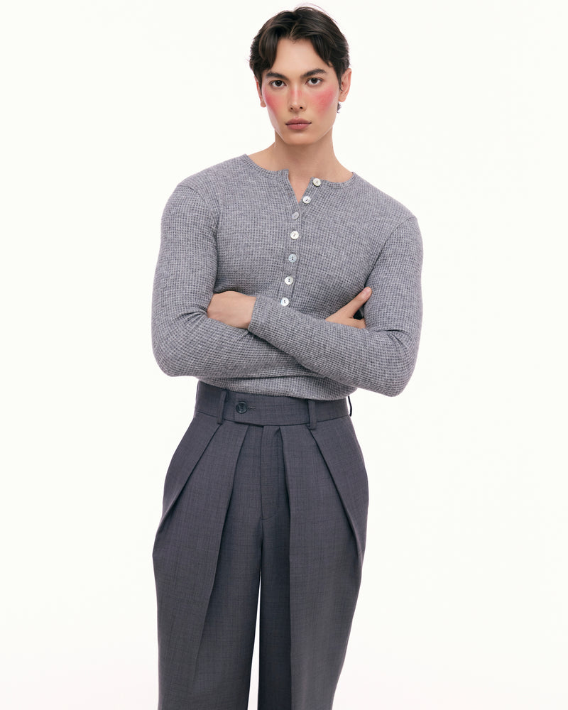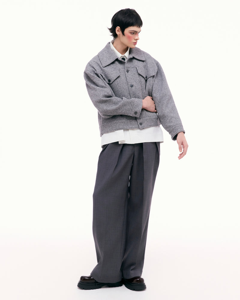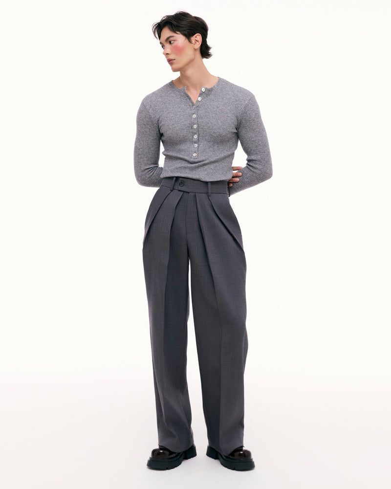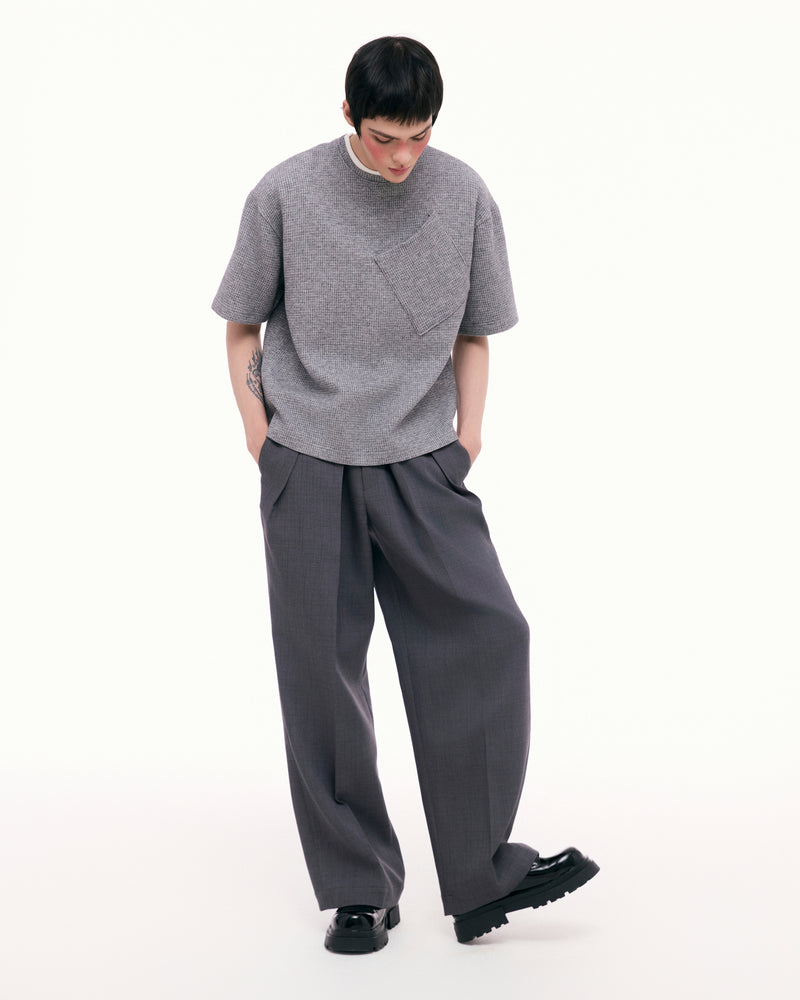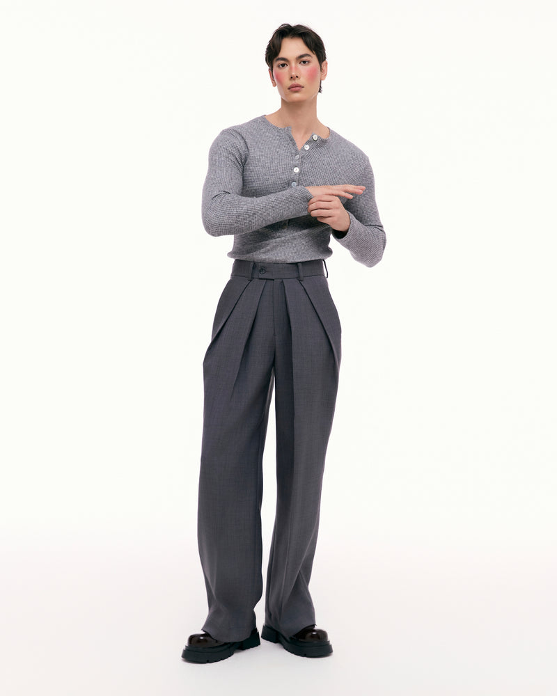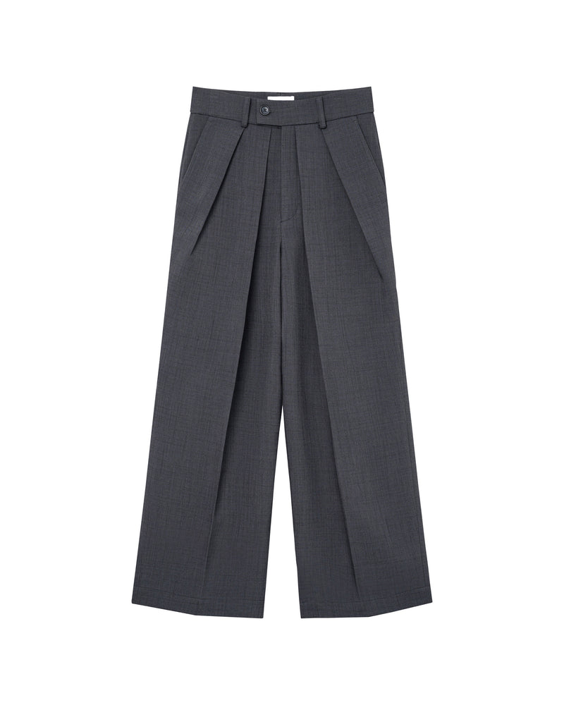 Straight-leg trousers featuring a wide waistband. The front is detailed with double pleats that create subtle volume and a structured silhouette, enhancing the form while ensuring comfort and ease of movement.