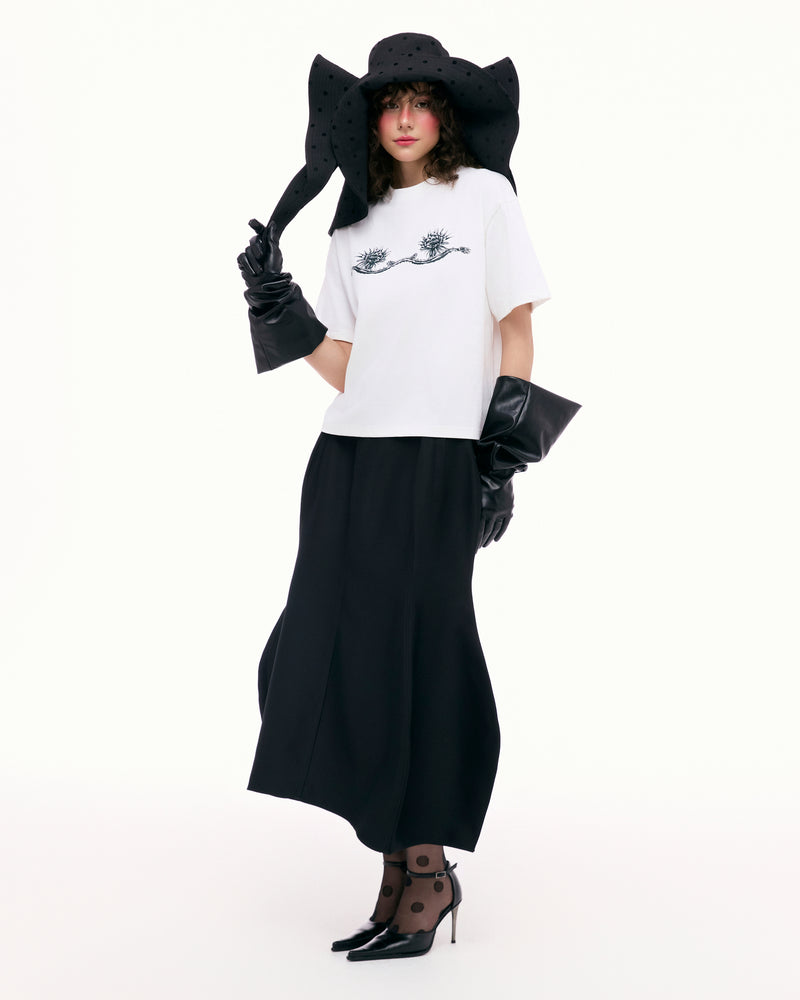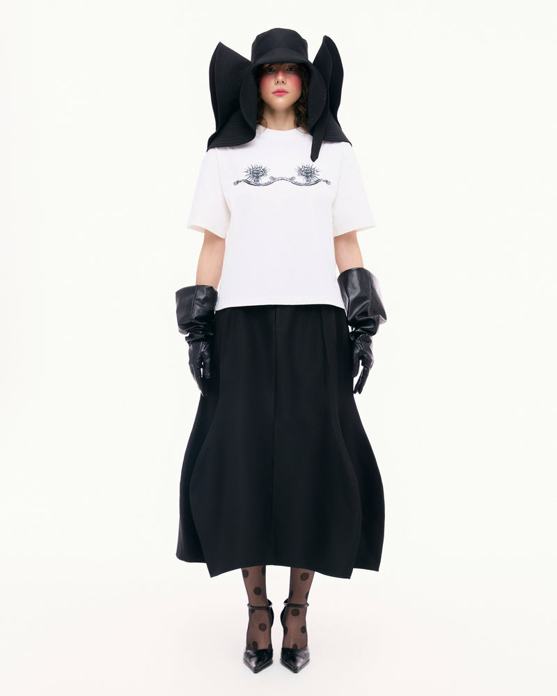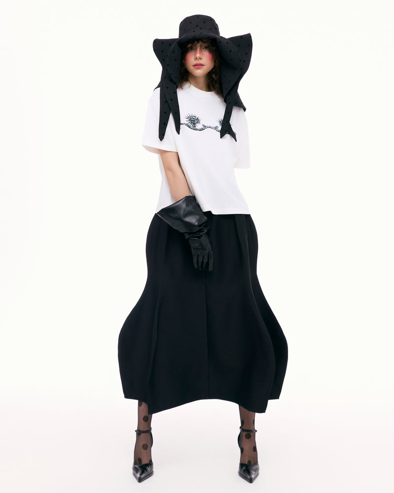 The Dragon Fruit A-line Skirt is inspired by the organic form of the dragon fruit trunk, highlighted through soft, curved cutlines that create a gentle volume. The skirt is divided into multiple segments, echoing the structure of the plant and delivering a dynamic visual effect that moves gracefully with each step.