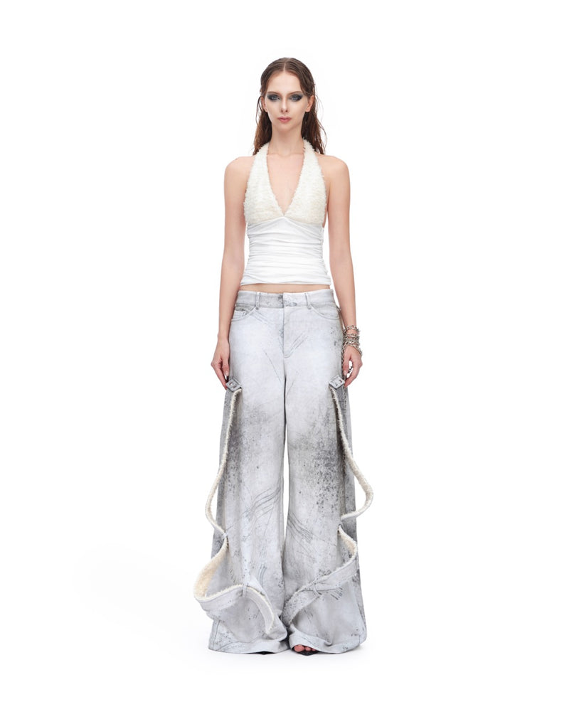 - The rugged, worn-in wash adds a gritty, street-inspired vibe, while the unexpected fur detail elevates the look with a playful yet edgy contrast.