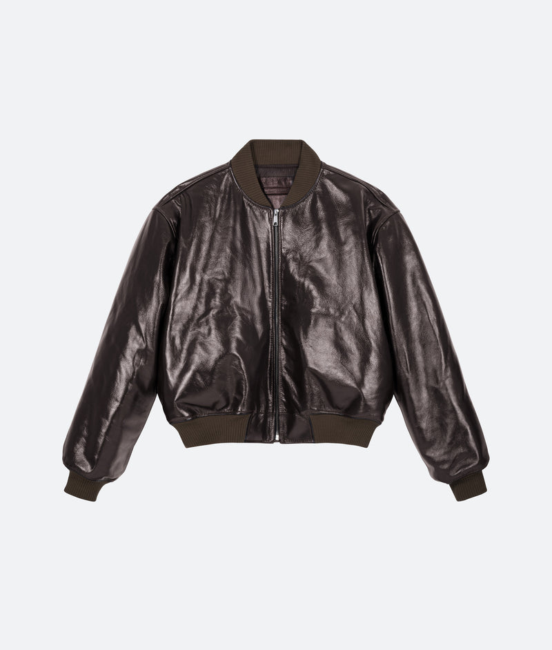 The bomber jacket is cut to a cropped fit, wide sleeves, and rib-knit waist hem and cuffs. Crafted from cowhide leather and finished with a smooth viscose lining for added comfort.