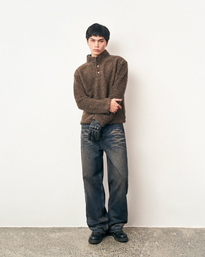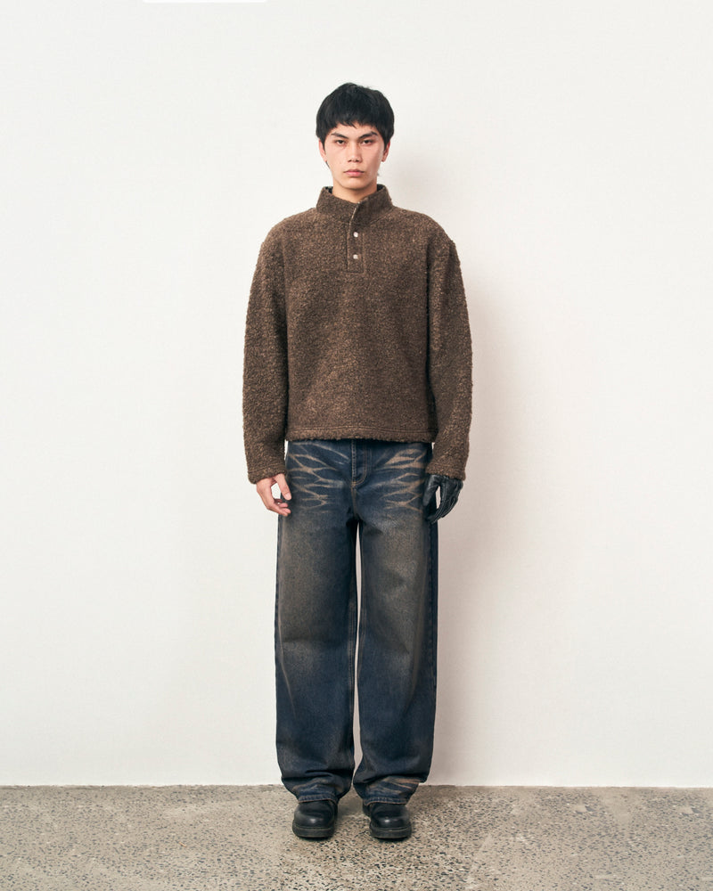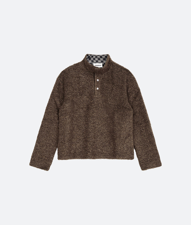 Crafted from brown polar fleece fabric, this pullover features a boxy fit, a spread collar, and silver-tone snap buttons.