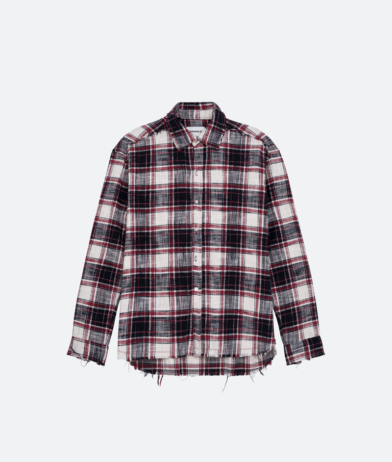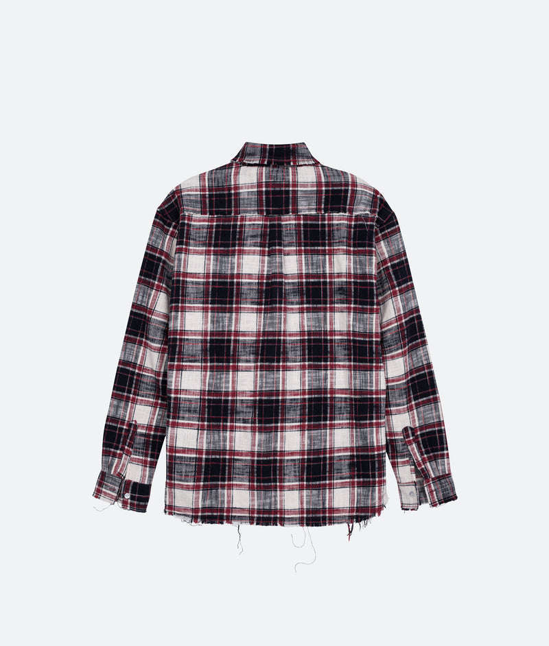 The check shirt is cut to an oversized fit, featuring dropped shoulders and a curved hem with raw details on the cuffs, hem, and collar.