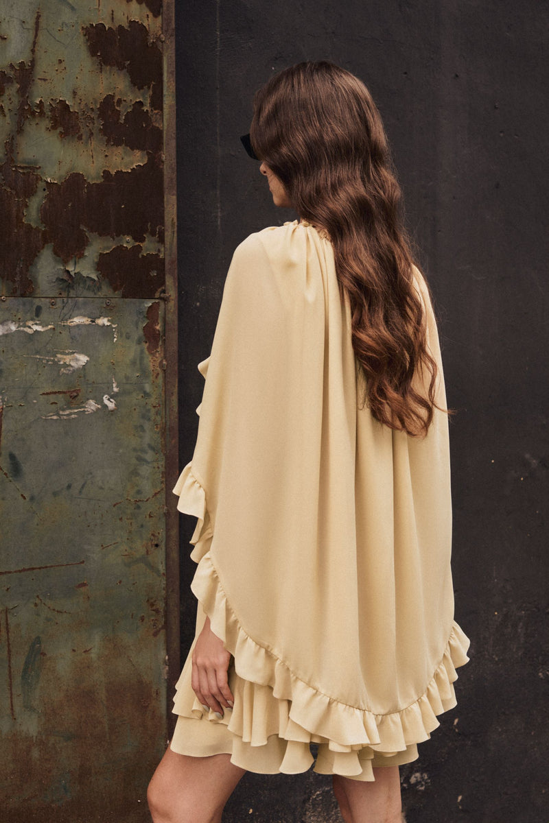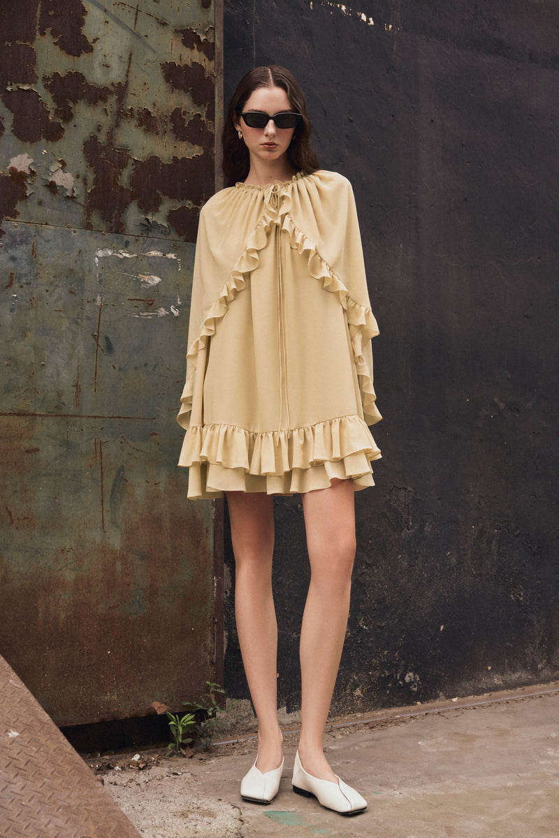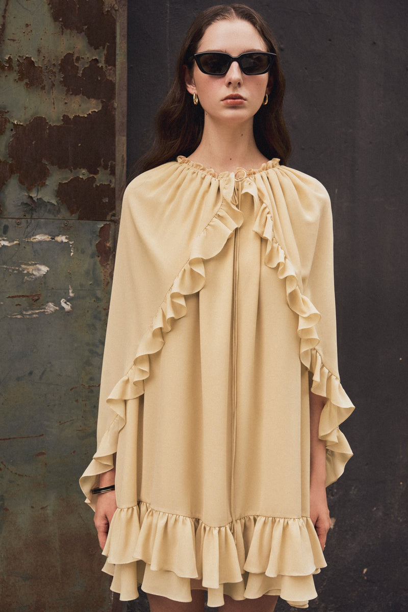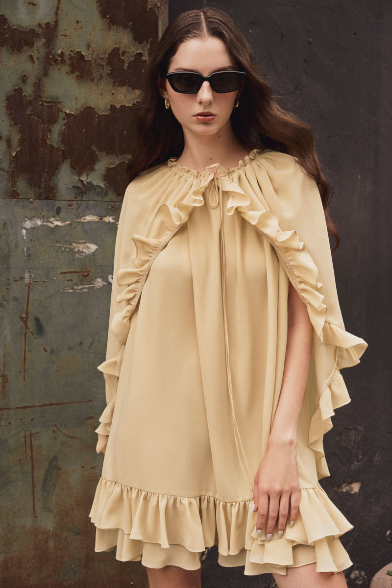 - Gold sand chiffon ruffled dress.