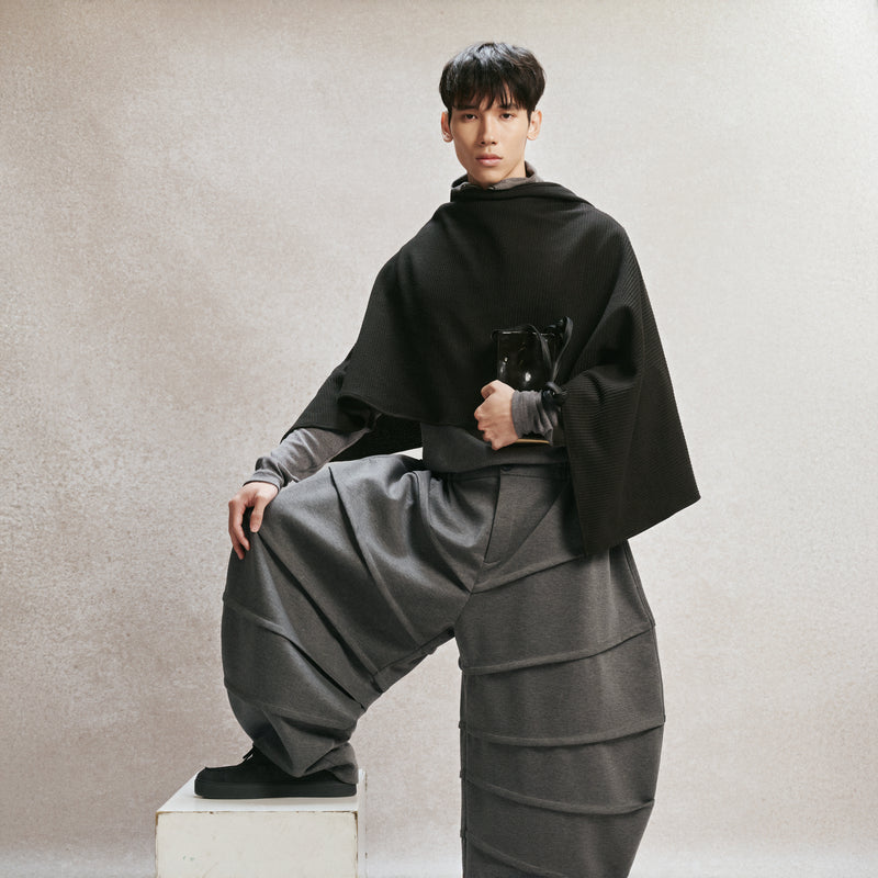 - Barrel pants inspired by the silhouette of a pottery vessel.