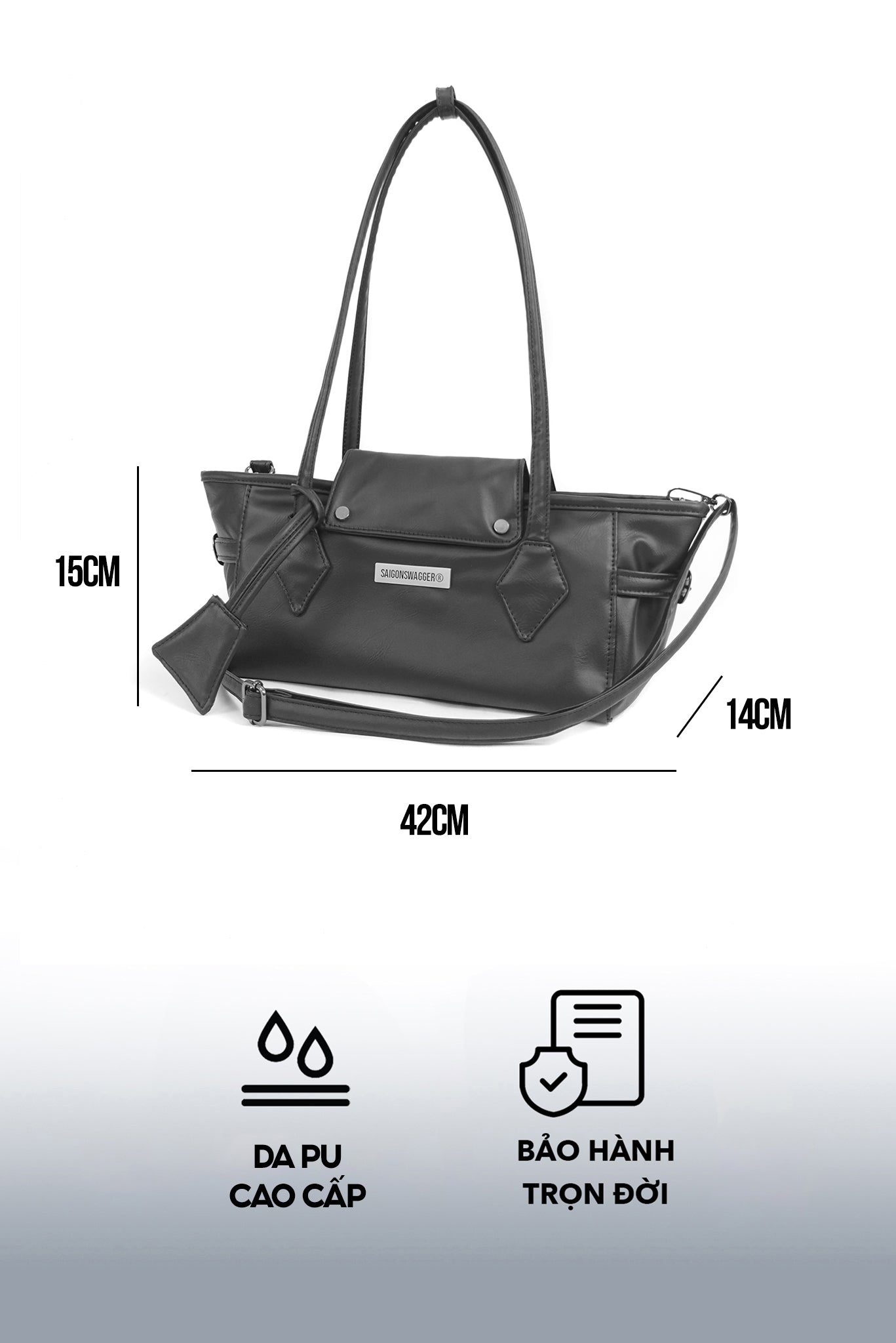 - Crafted from premium PU leather with a smooth finish, the bag features a water-repellent Oxford lining, sturdy metal zippers, and an anti-rust alloy logo.