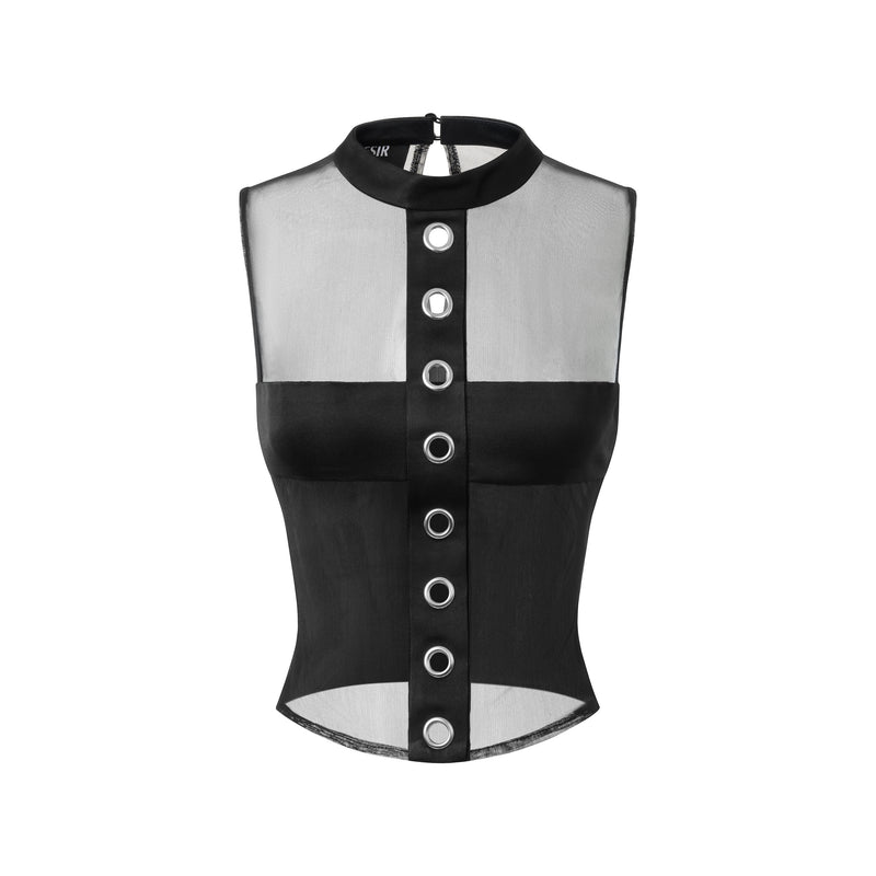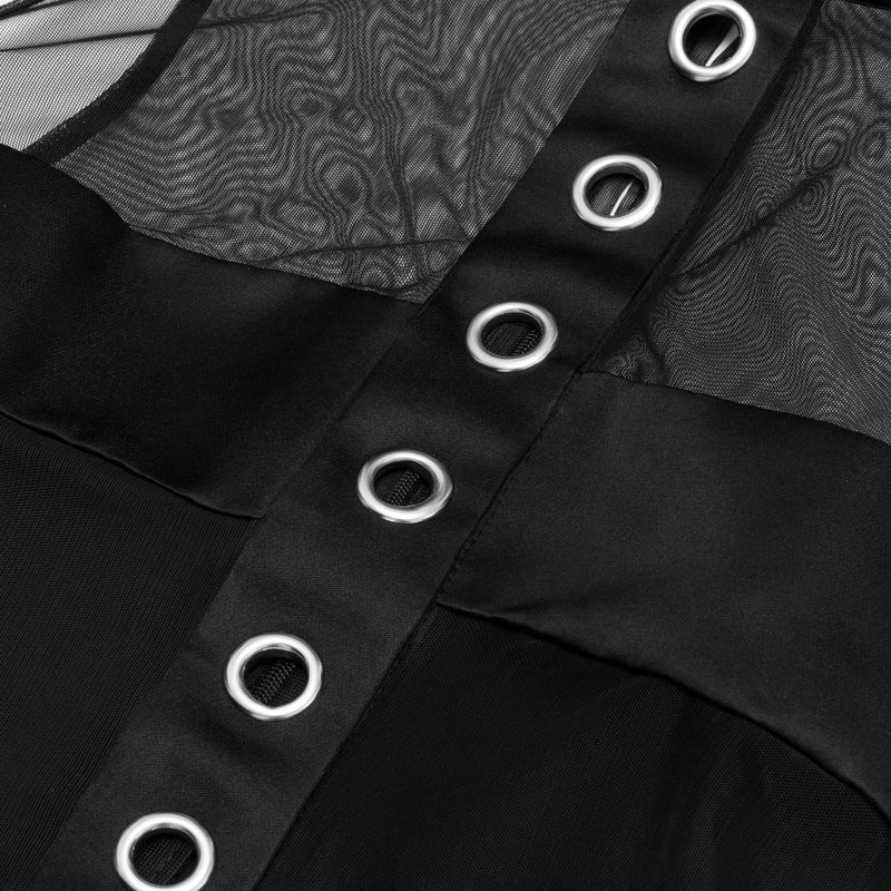 - Fabric material: Sheer mesh fabric combined with matte satin panels.