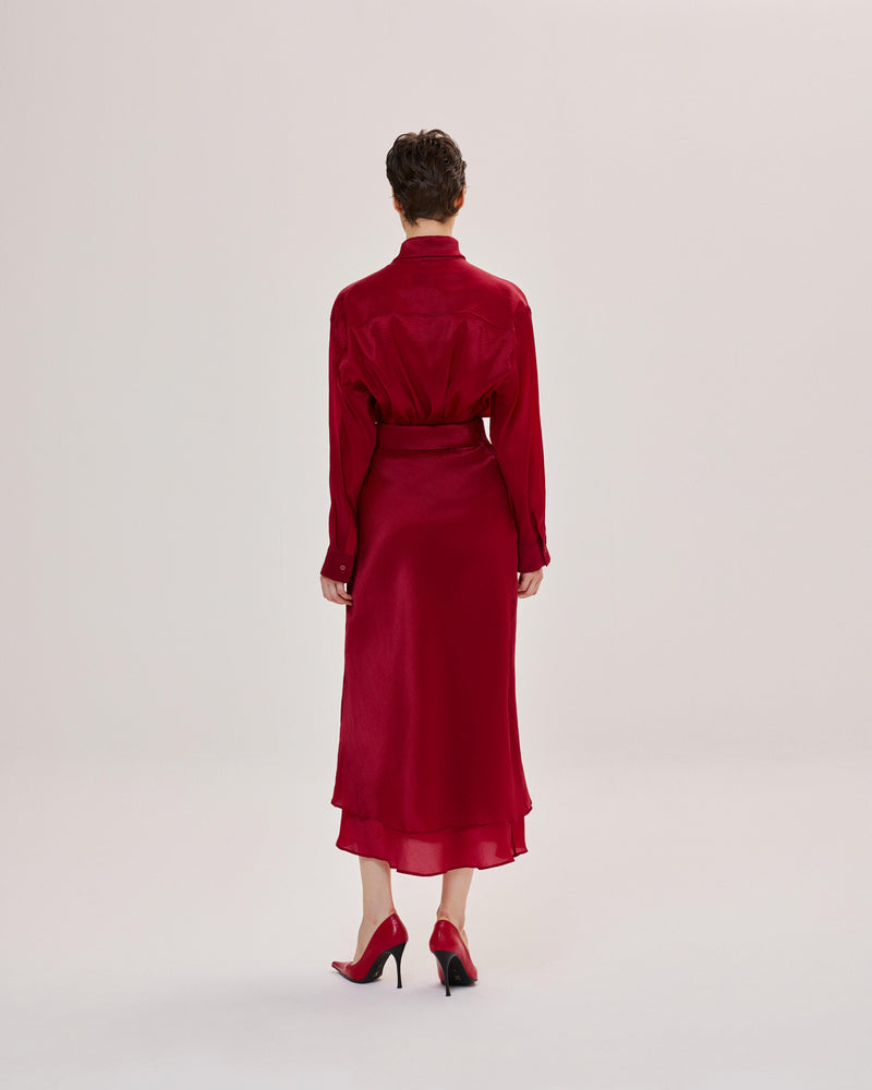 - Sewn in 2 layers, the back of the dress has an additional outer belt.