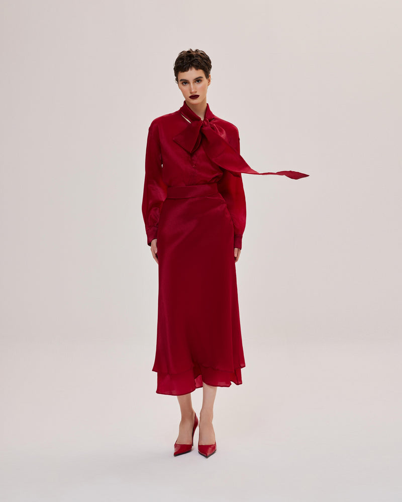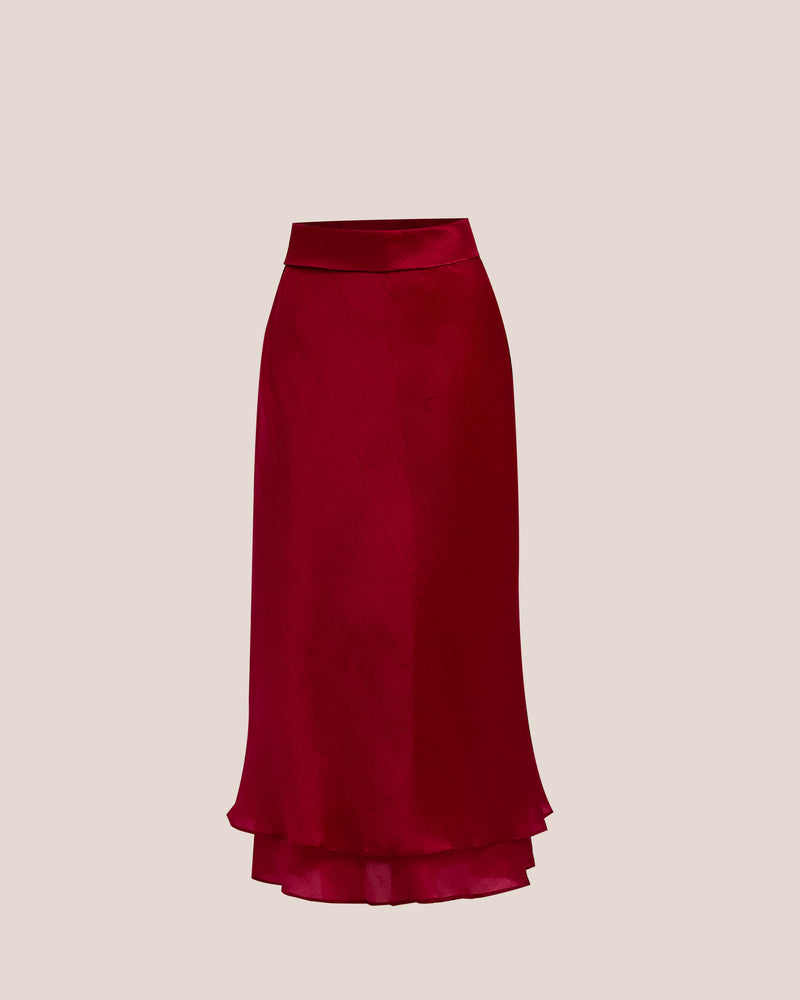 - The skirt is cut on a slanted fabric, with a certain drape to help accentuate the bust.