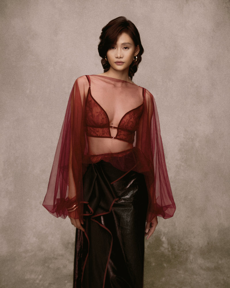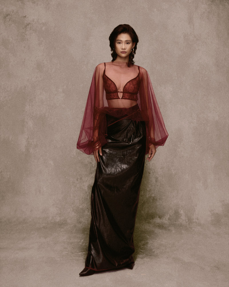 - A graceful Mandarin-inspired collar meets striking tie details, shaping a look that is unapologetically feminine, bold, and sensual.