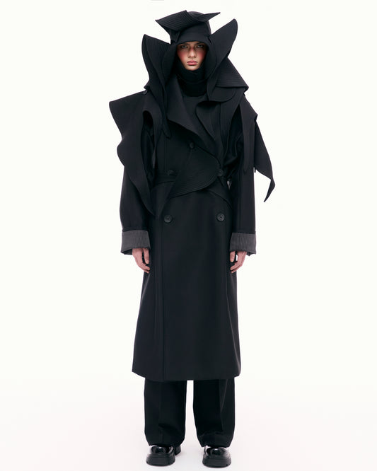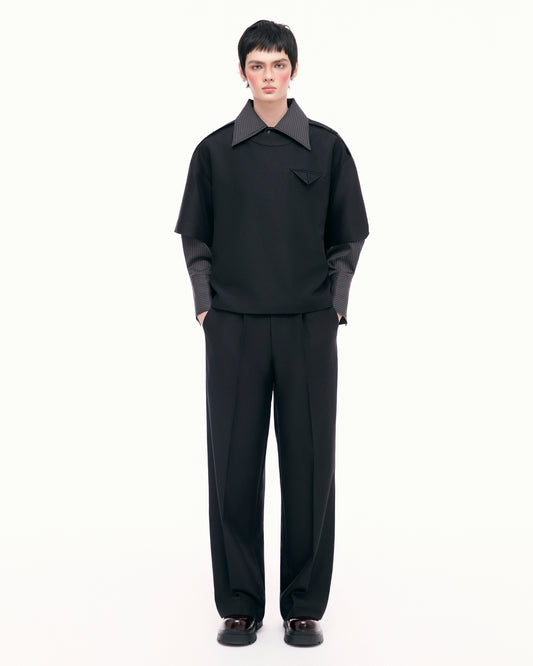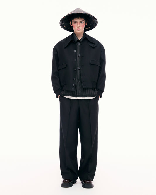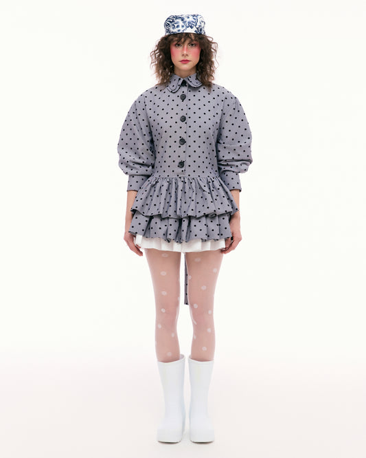 - The shirt is loose-fitting, made from synthetic organza fabric with slight see-through, combining many overlapping fabric layers to create a layered effect. The buttoned shoulders and waist can be easily removed during wearing. The hem of the shirt is contoured in curved lines, creating random lines on the shirt.