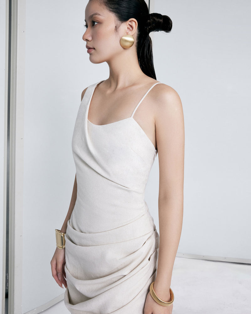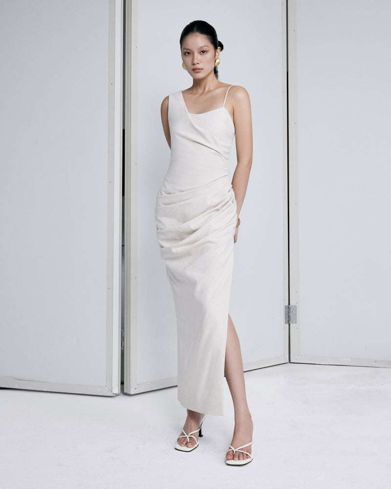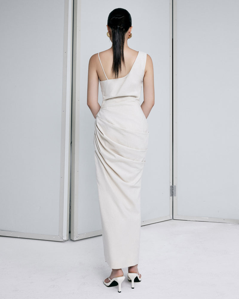 - Crafted from beige linen, this asymmetric dress features a white silk habotai lining.