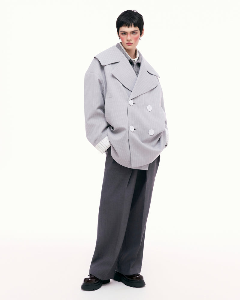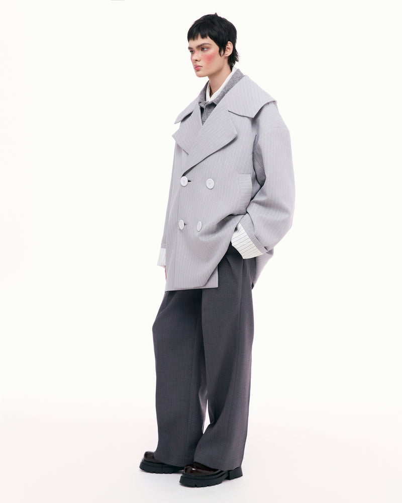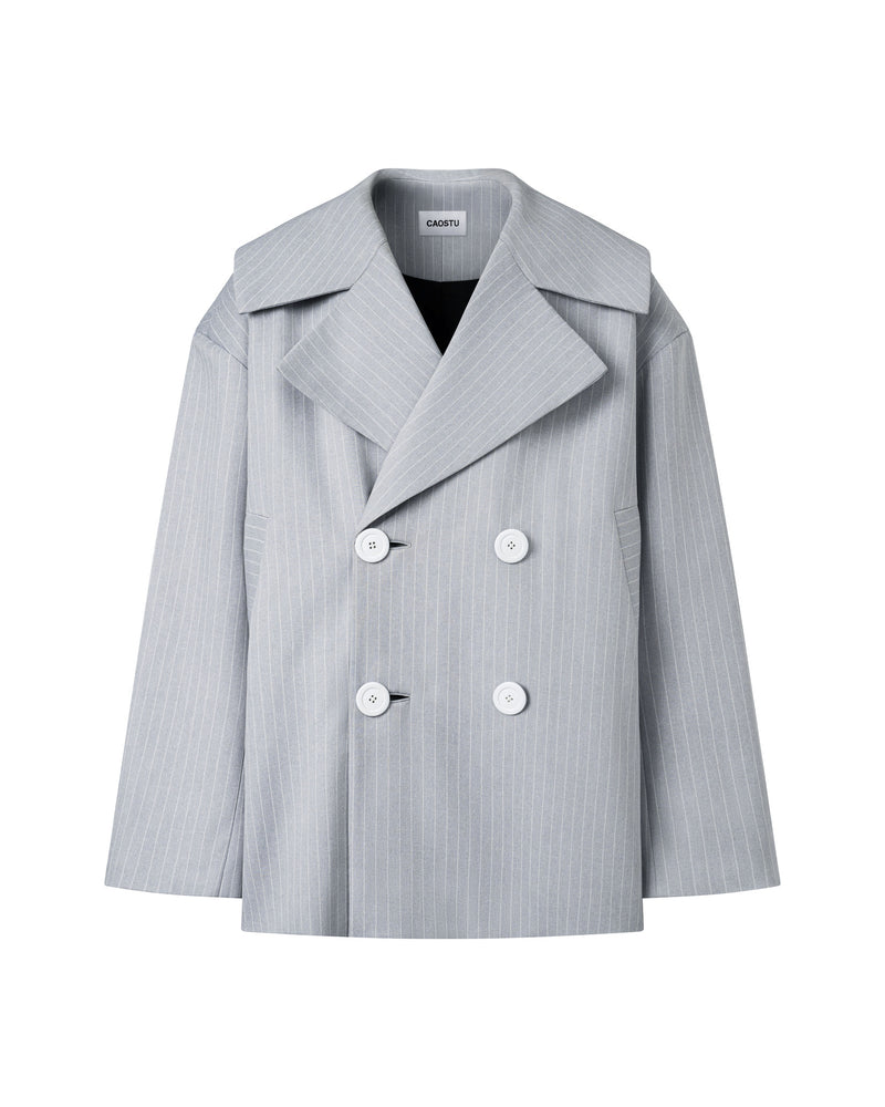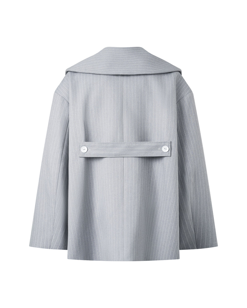 A boxy-fit jacket featuring oversized buttons and a distinctive double-collar design with rounded, overlapping layers, complemented by two large front pockets.