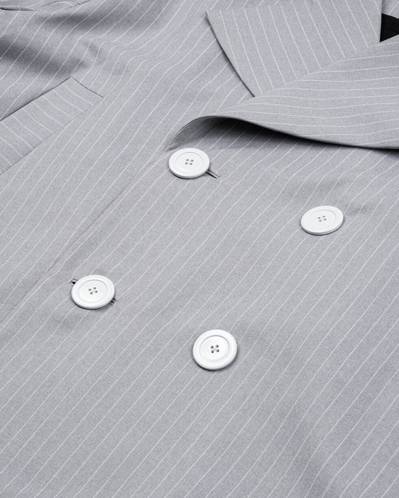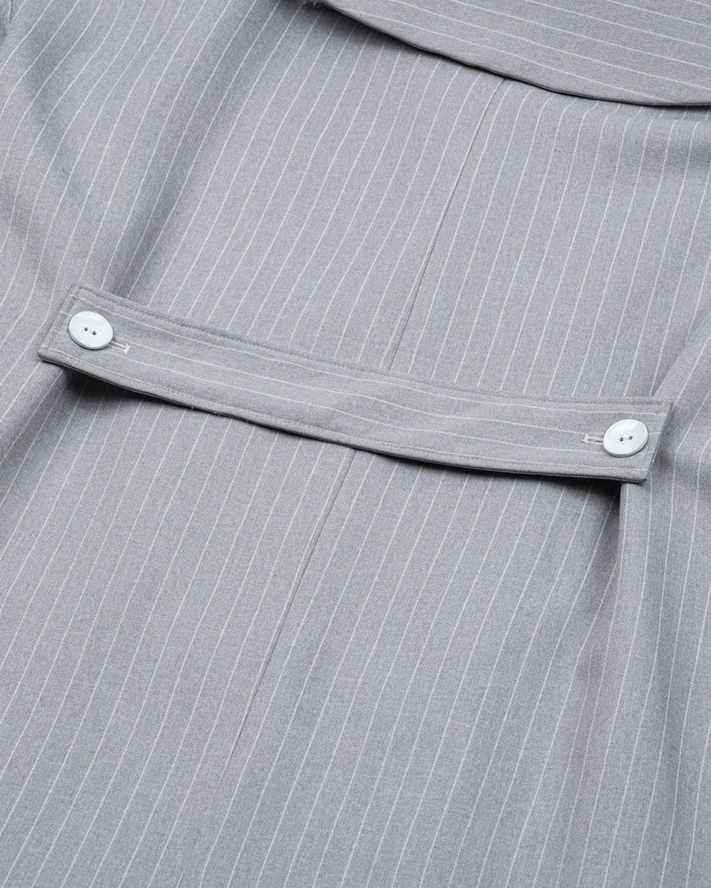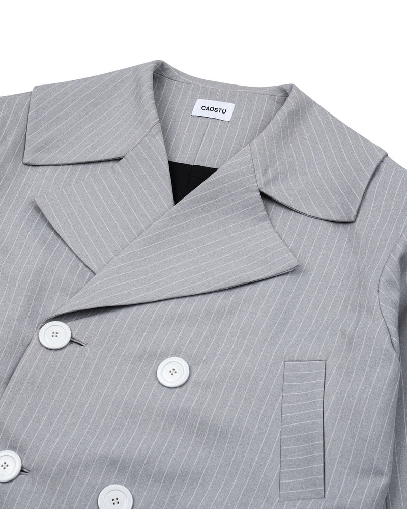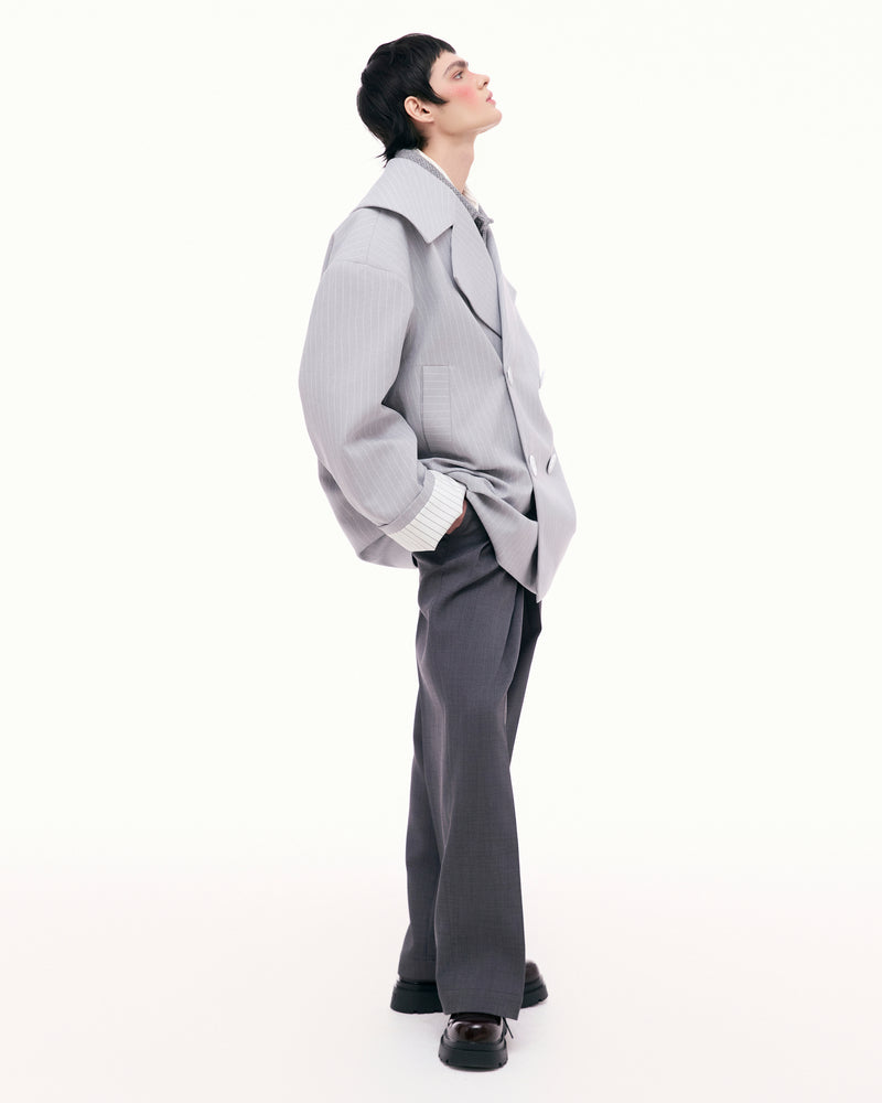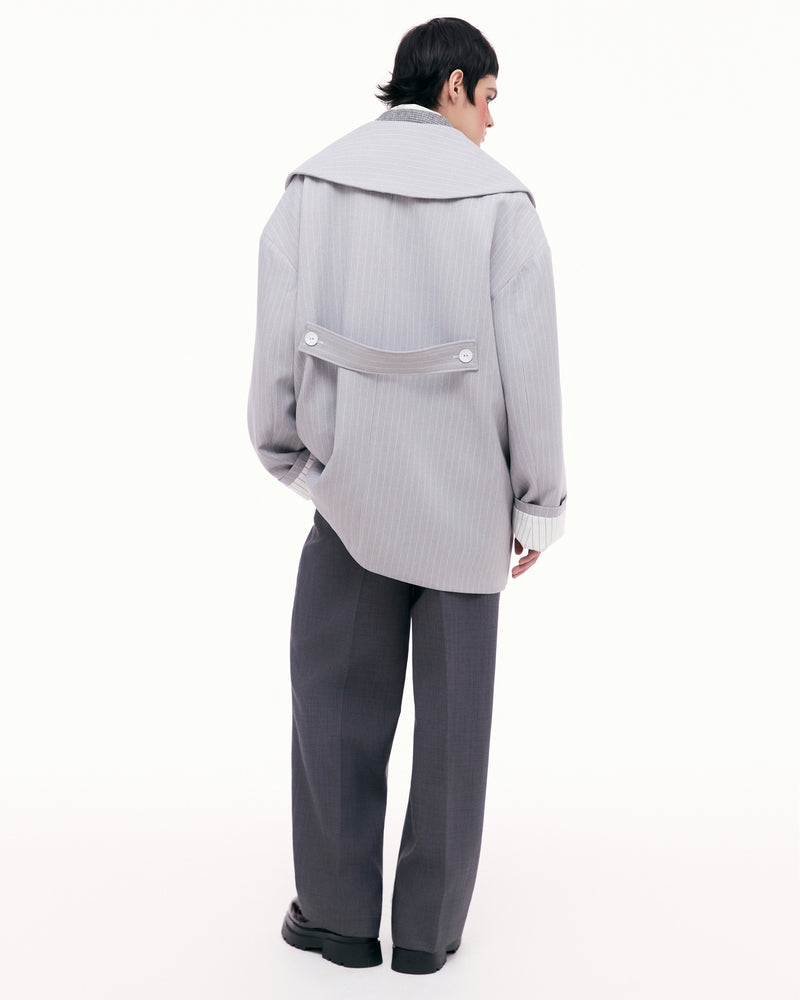 A boxy-fit jacket featuring oversized buttons and a distinctive double-collar design with rounded, overlapping layers, complemented by two large front pockets.
