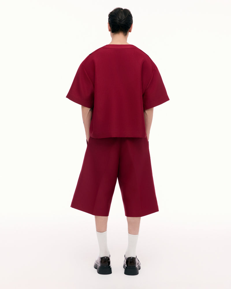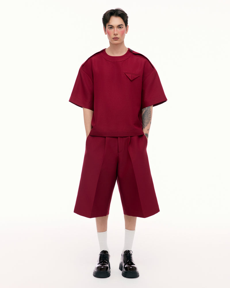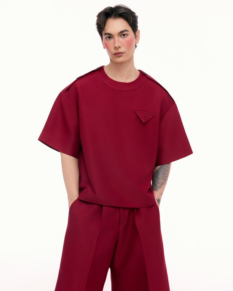 A boxy-fit shirt designed in CAOSTU’s signature red and black tones. The highlight lies in the shoulder area, featuring symmetrical oversized button plackets that can be detached to expand the fit. At the chest, a meticulously crafted folded triangular pocket adds a refined touch. The fabric is structured yet breathable, ensuring comfort while maintaining its shape.