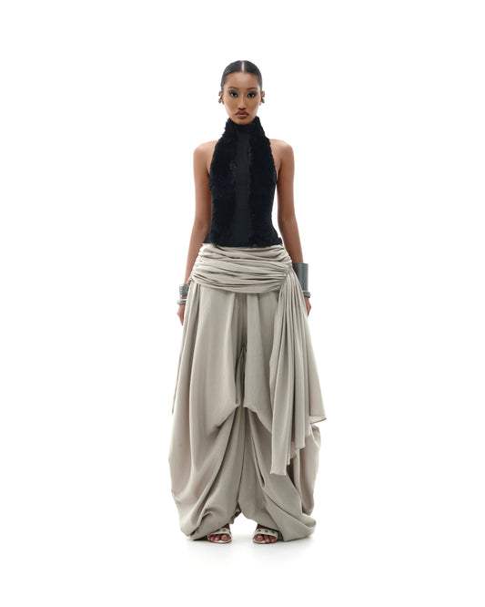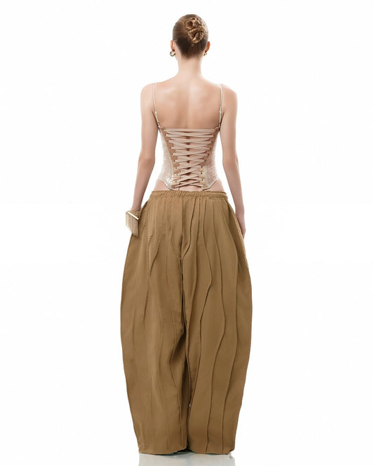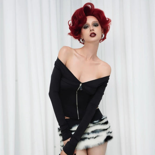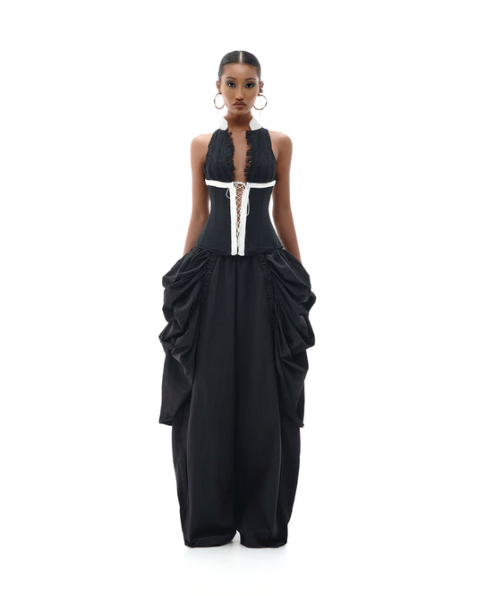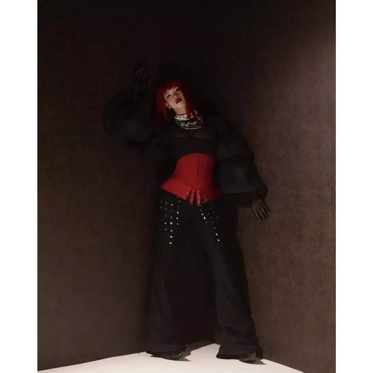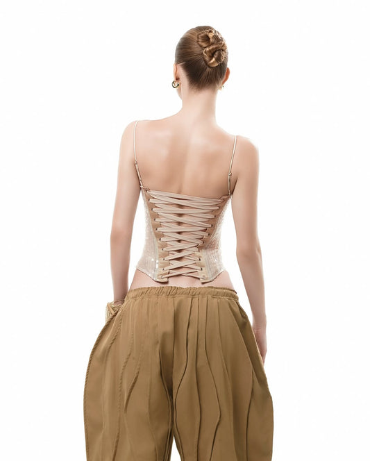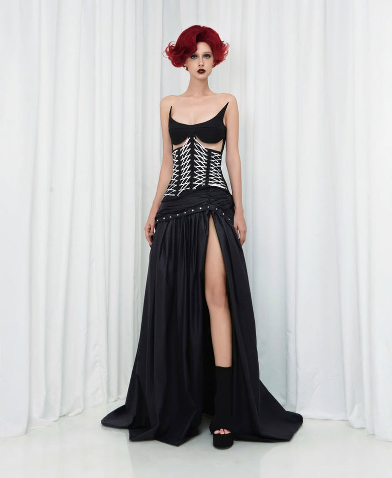 - The exposed design and asymmetrical bust line bring a modern, rebellious twist to the traditional corset silhouette.