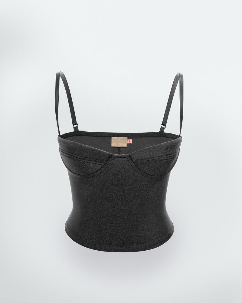 - Slim-fit corset-inspired top featuring delicate straps and sculpted cups.