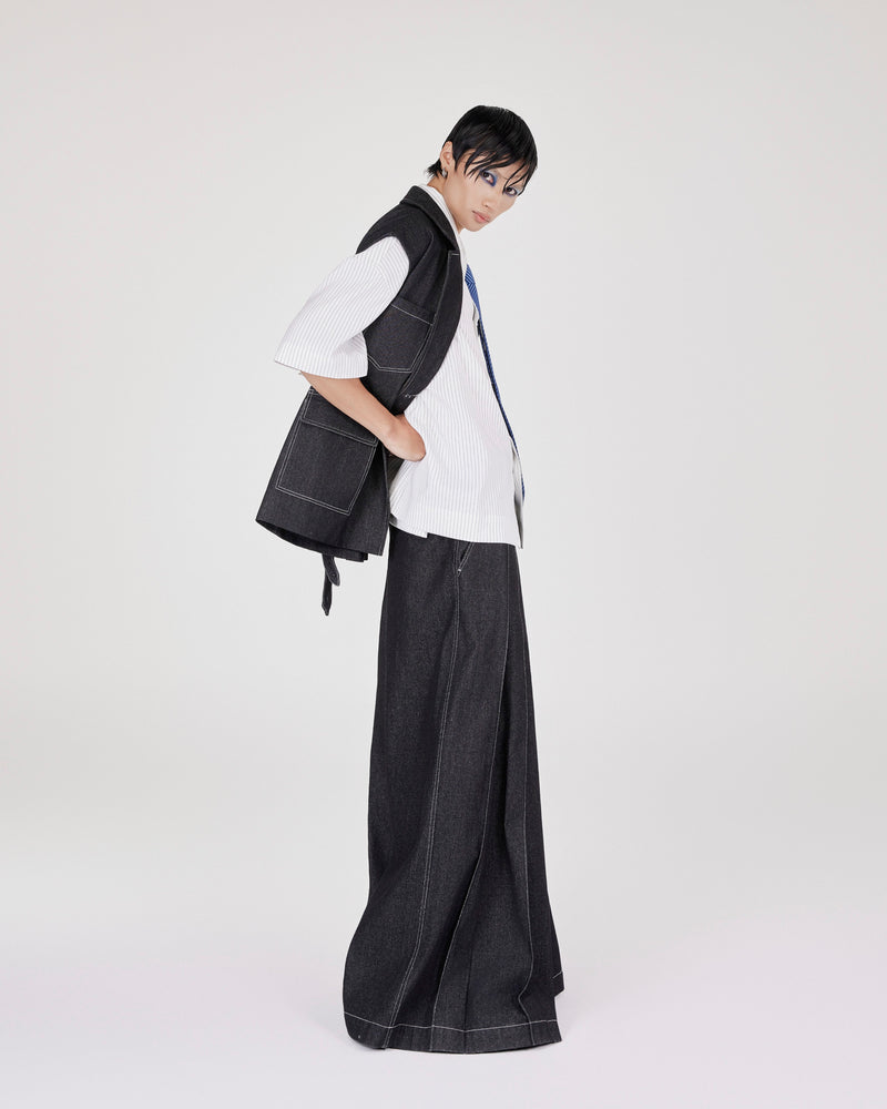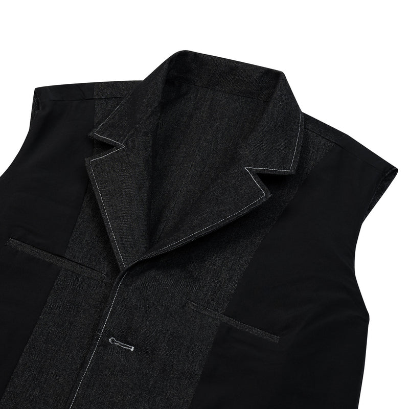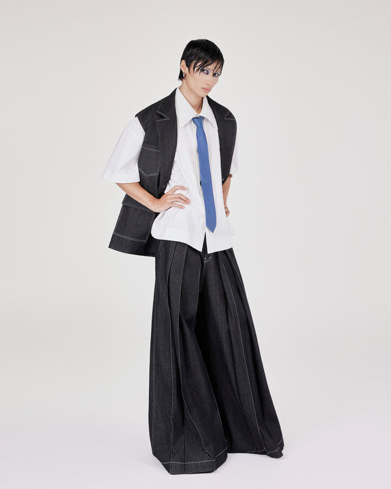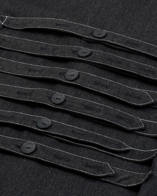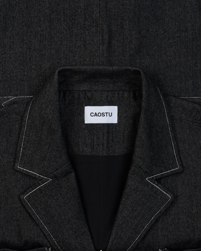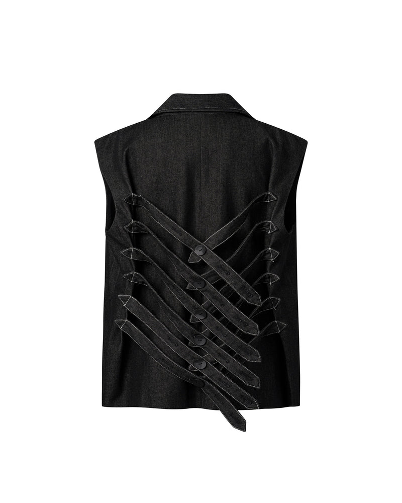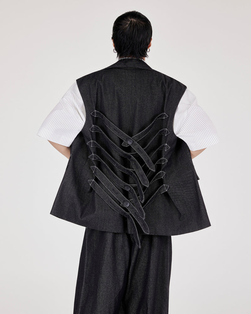 The thick denim fabric, paired with bold white topstitching, creates a powerful visual effect. The highlight is the back of the blazer, which features multiple interwoven straps that symbolize a beetle's legs. These straps are adjustable, allowing the wearer to cinch or loosen them to suit their desired style.