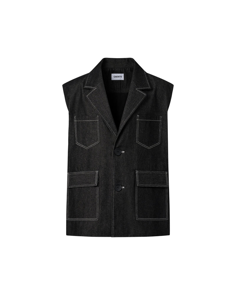 Description: This is a comfortable, oversized, short-sleeved blazer with a stylized design and two traditional oversized buttons. It features a sharp vest collar combined with a symmetrical four-pocket system—two flap pockets and two square chest pockets.