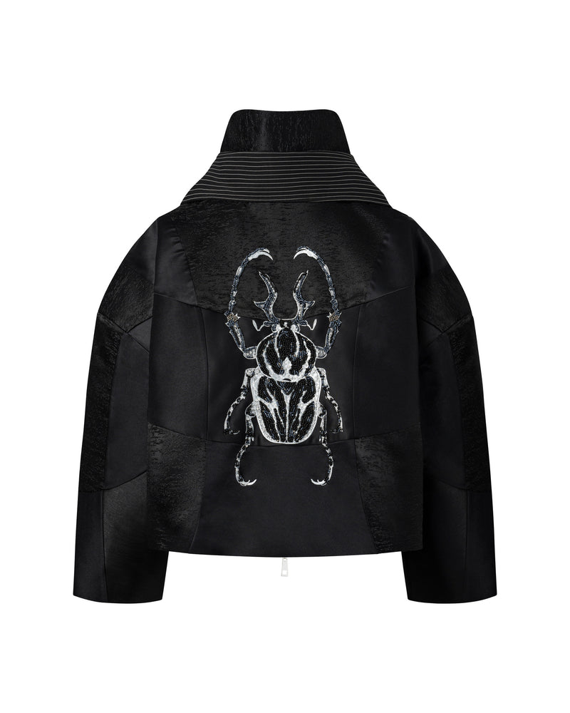 - The centerpiece is the beetle motif on the back, crafted with the tatami embroidery technique and combined with meticulously hand-beaded details of intertwined beads and crystals.