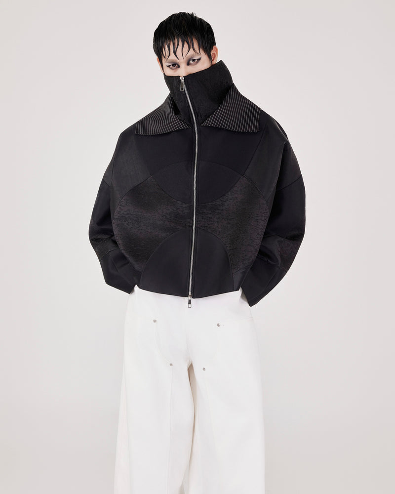 - The jacket also features a double-layered collar with an unconventional high-neck striped inner layer, giving the wearer a mysterious and fashionable feel.